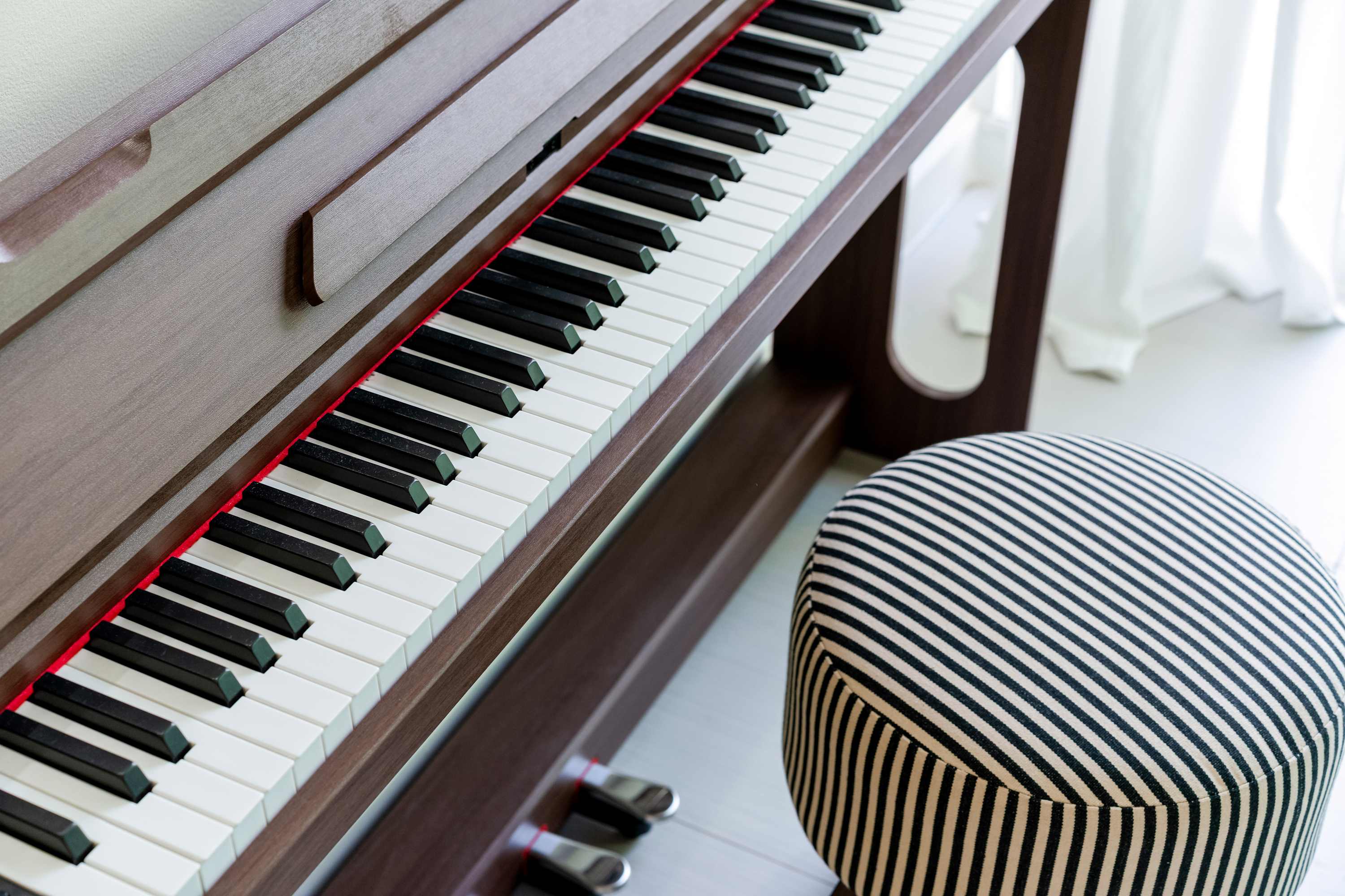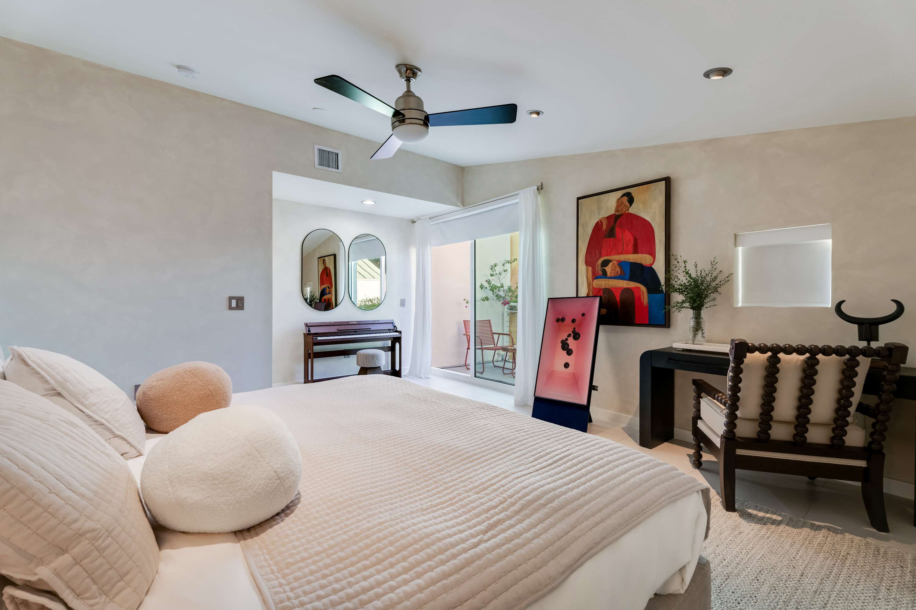 A serene primary suite featuring a king-size bed, generous storage, private en-suite bathroom, desk, piano, and access to a private terrace, perfect for quiet mornings above the garden.