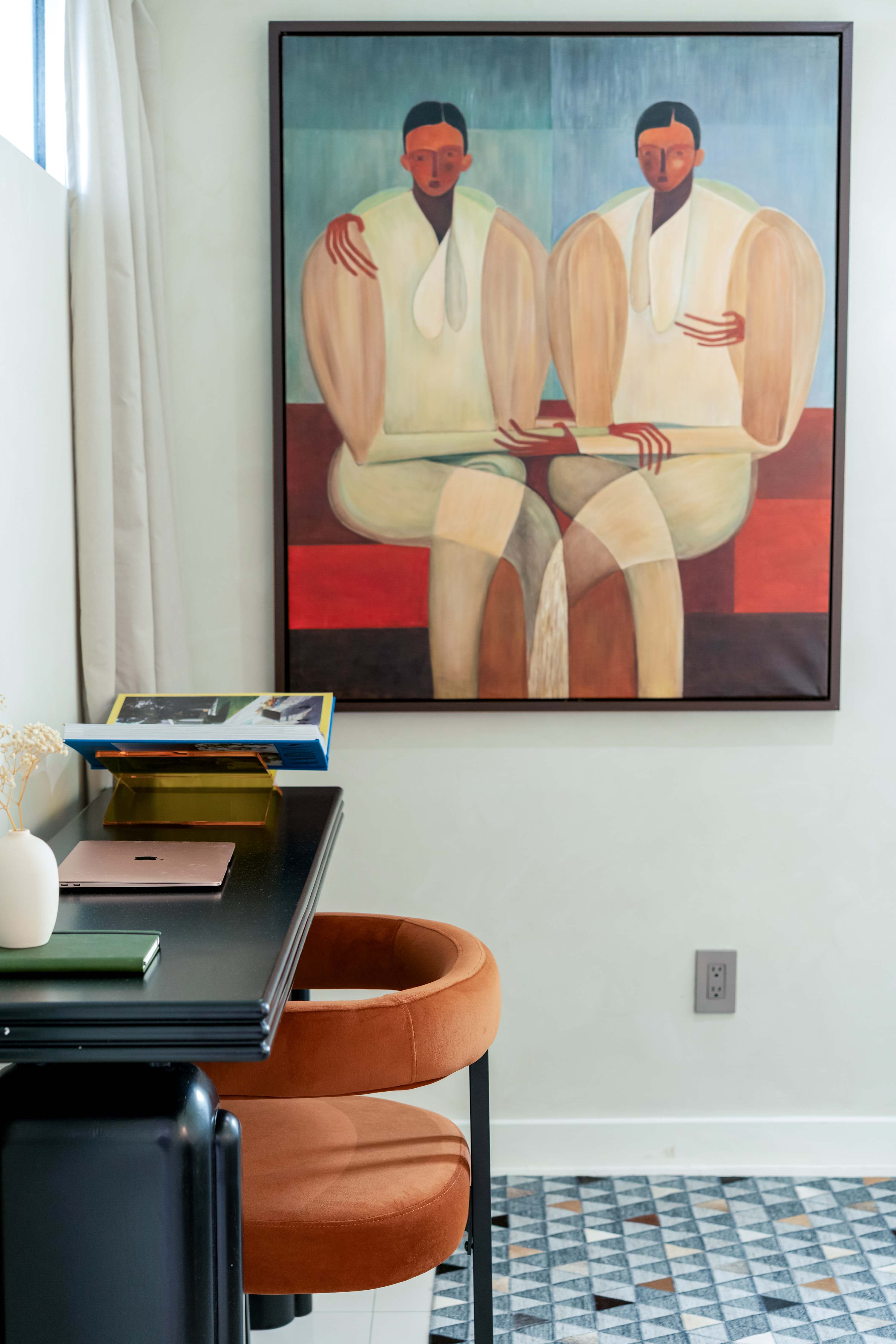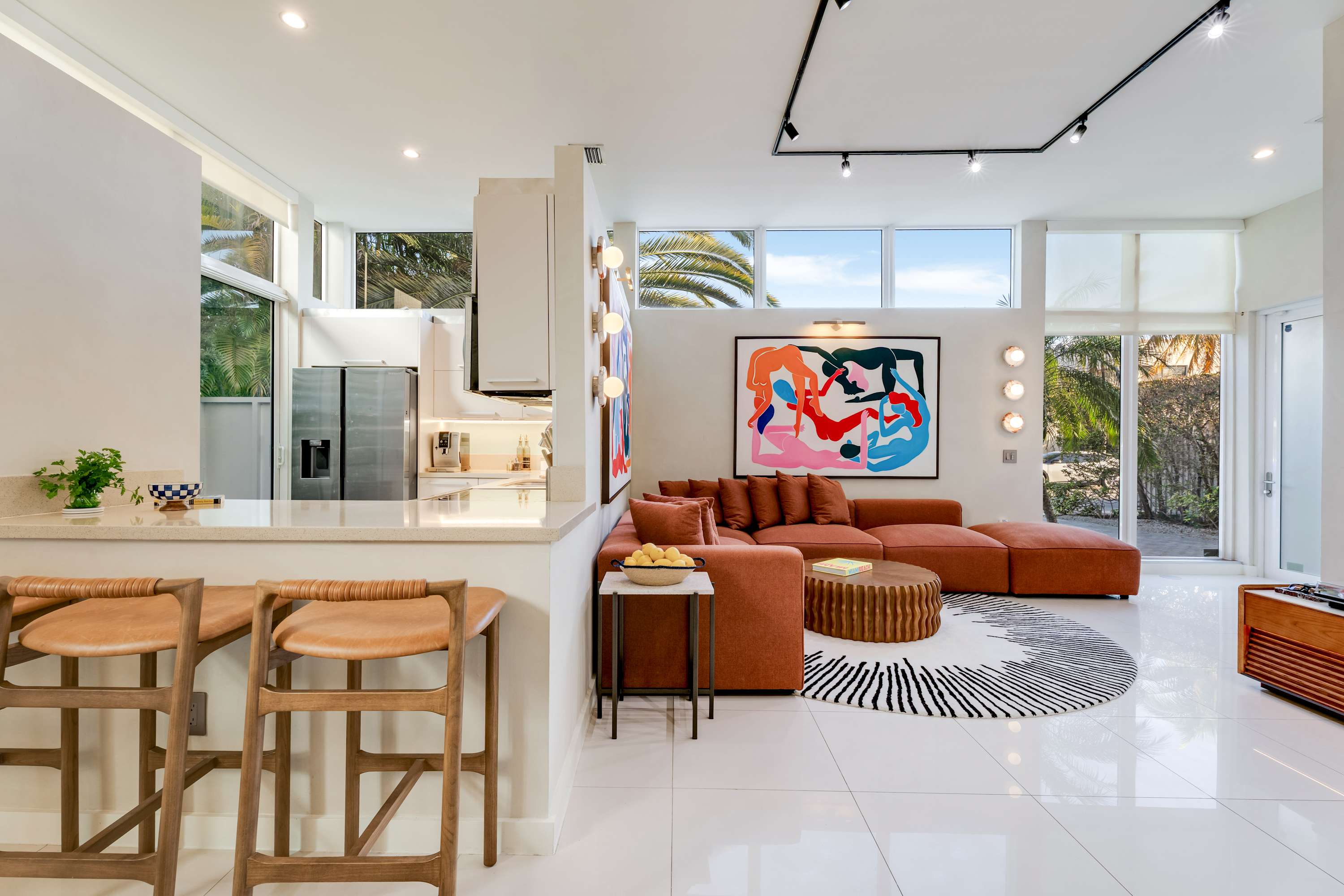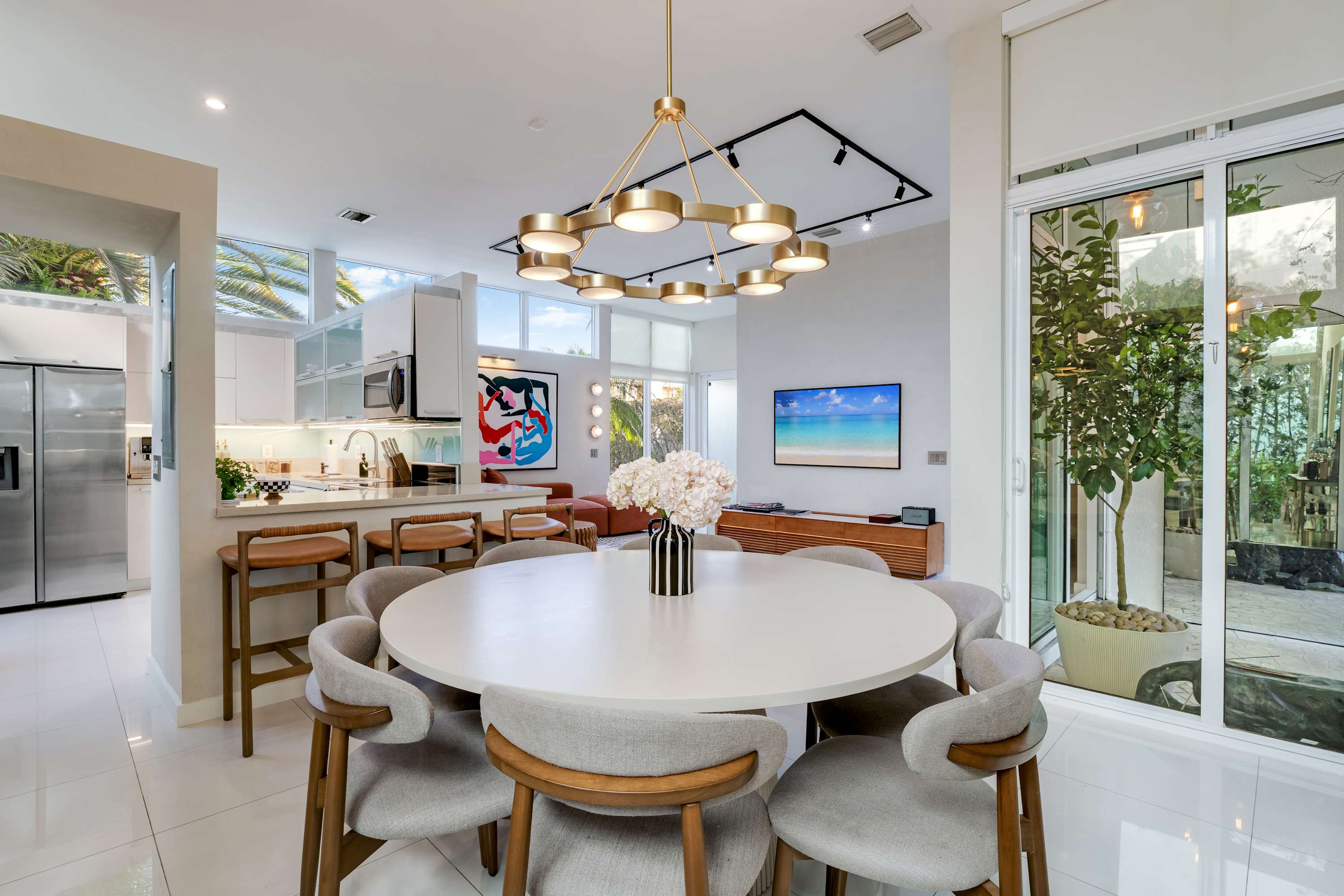 A spacious and sun filled living area anchored by custom artwork and original design elements. Comfortable seating surrounds a large smart TV and record player, with an open flow into the dining area featuring seating for eight, ideal for shared meals and relaxed evenings.