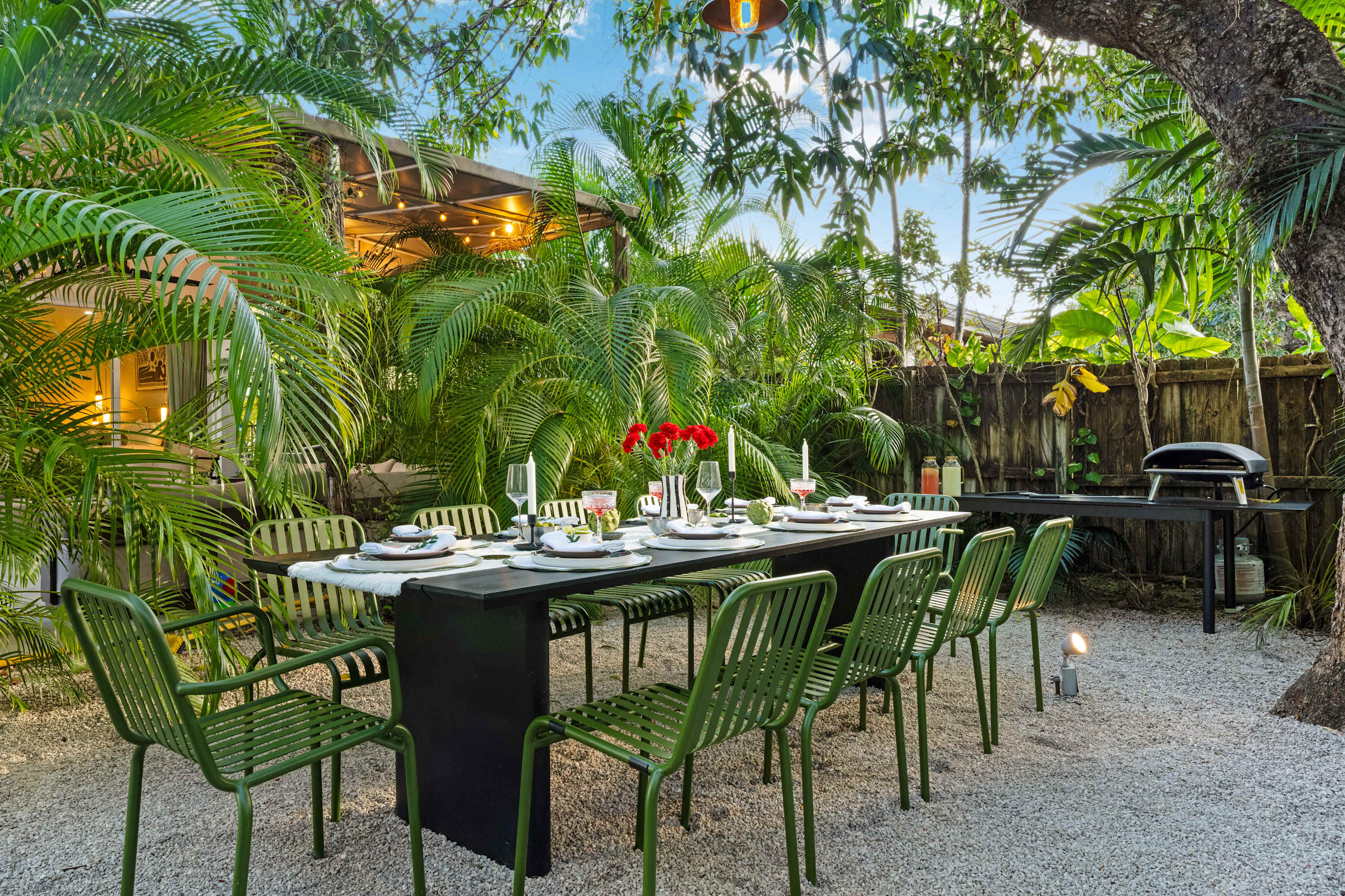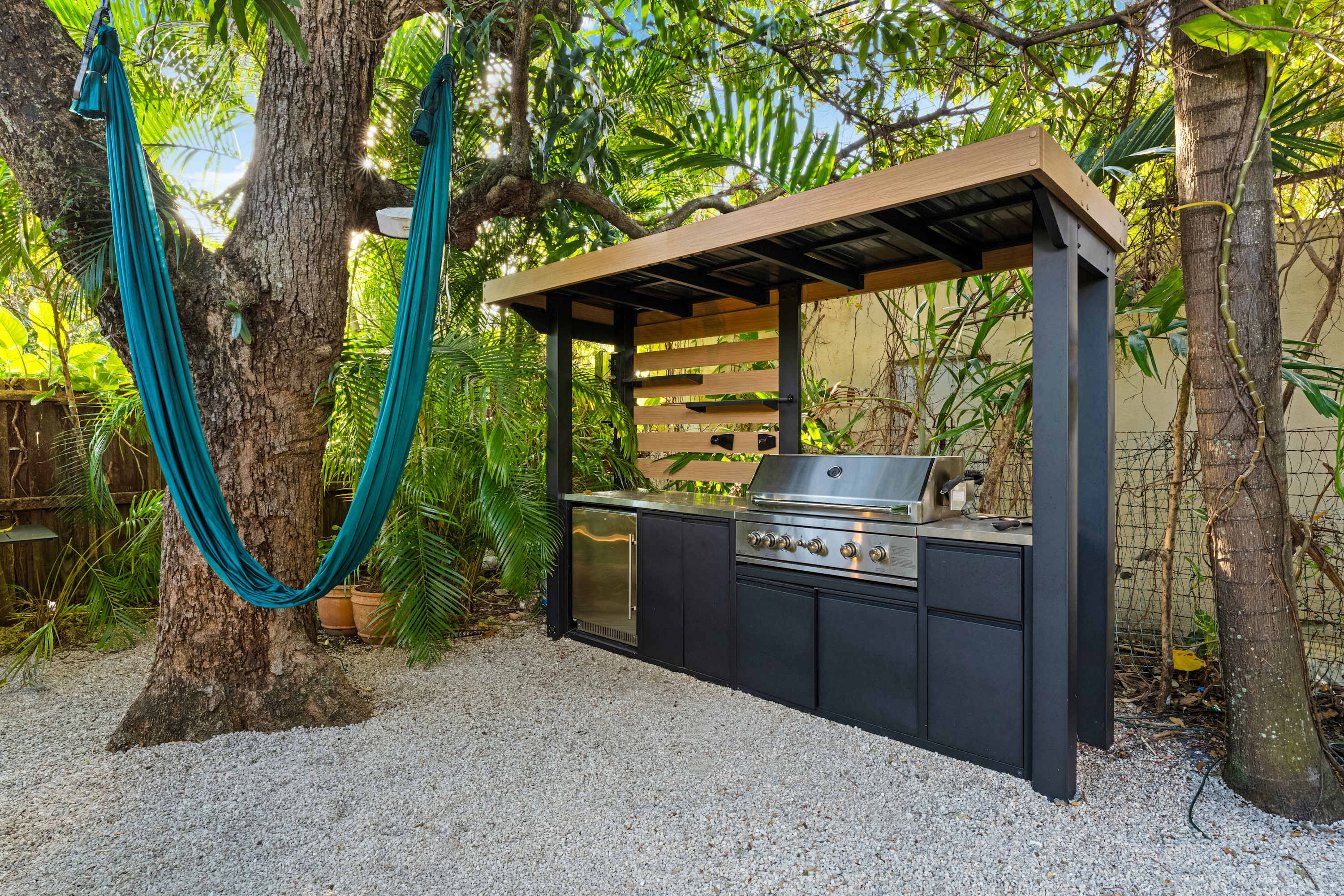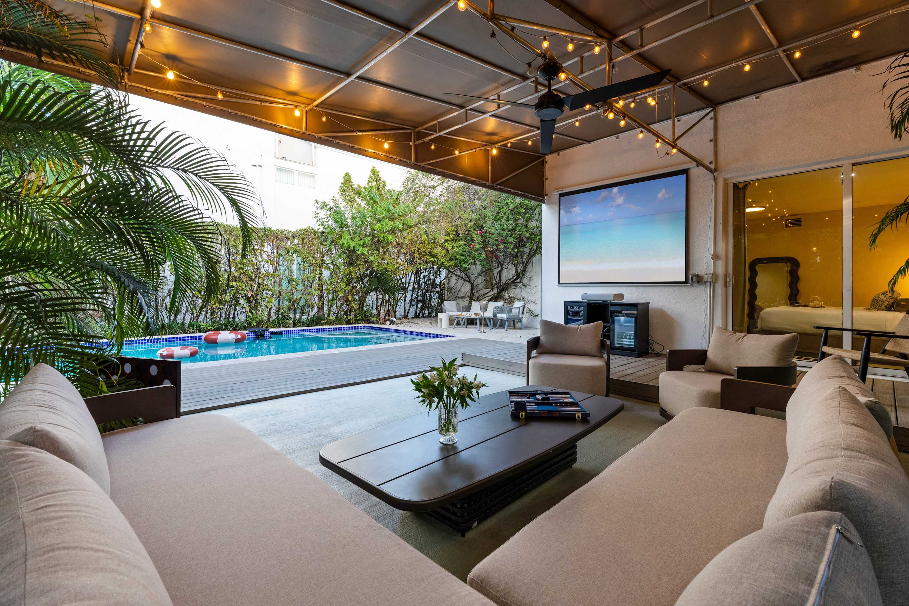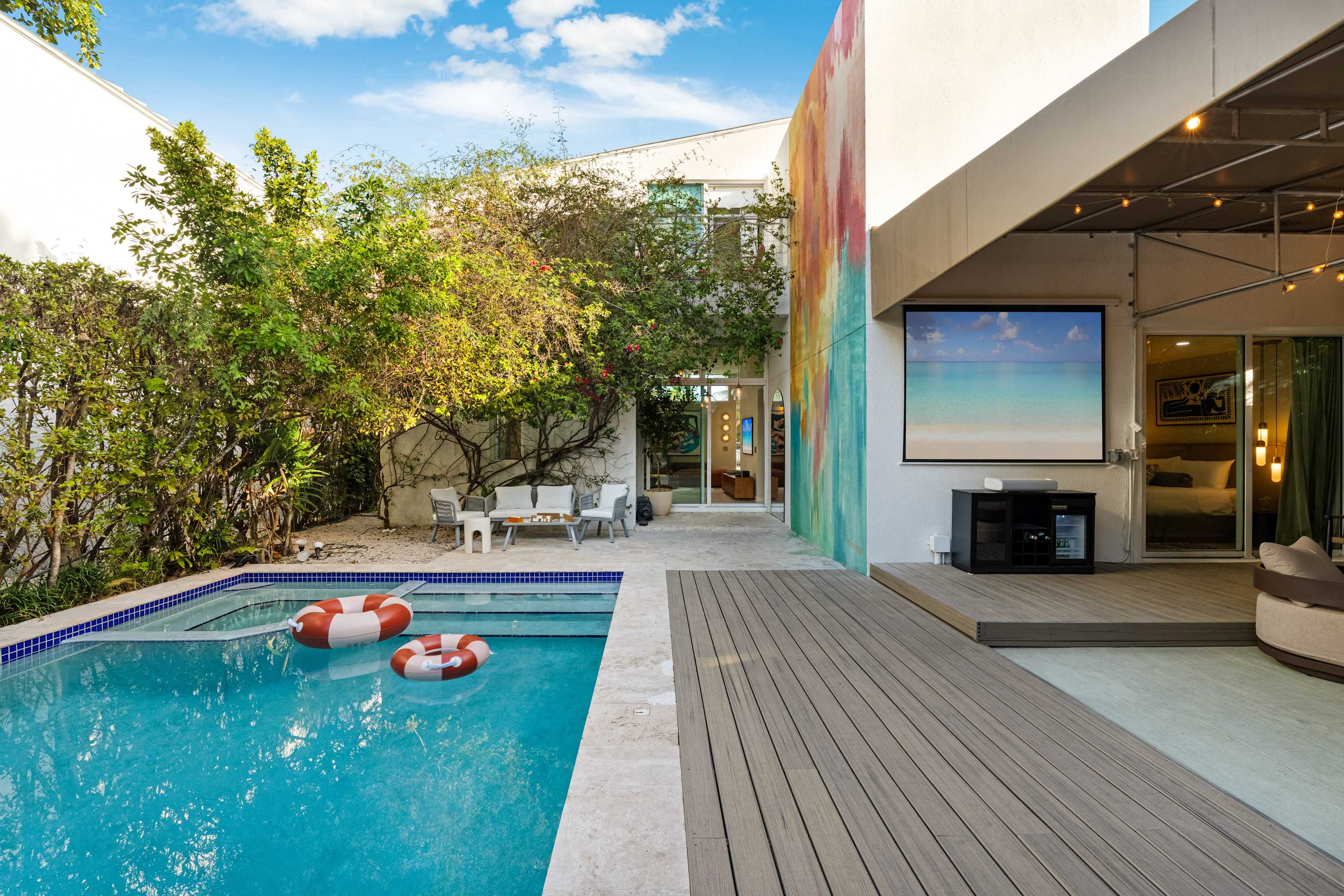 The heart of the home. A private garden sanctuary featuring a heated pool, summer kitchen, shaded dining areas, and an outdoor movie projector for unforgettable nights under the stars. Custom murals by local Miami artists create a one-of-a-kind backdrop, while the fully fenced yard offers complete privacy. Perfect for garden dinners, afternoon swims, or slow evenings beneath the trees.