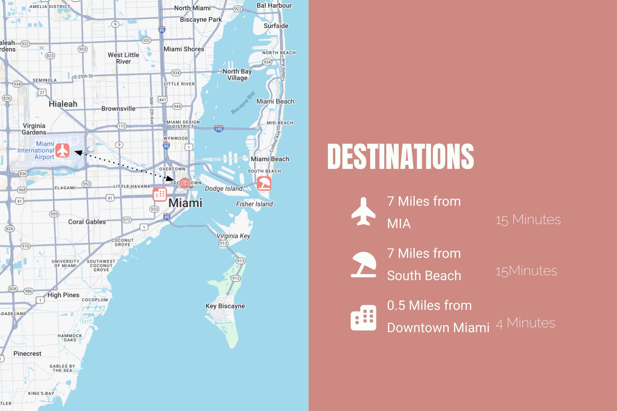 Miami Beach (South Beach): 10–15 minute drive (4.5 miles)