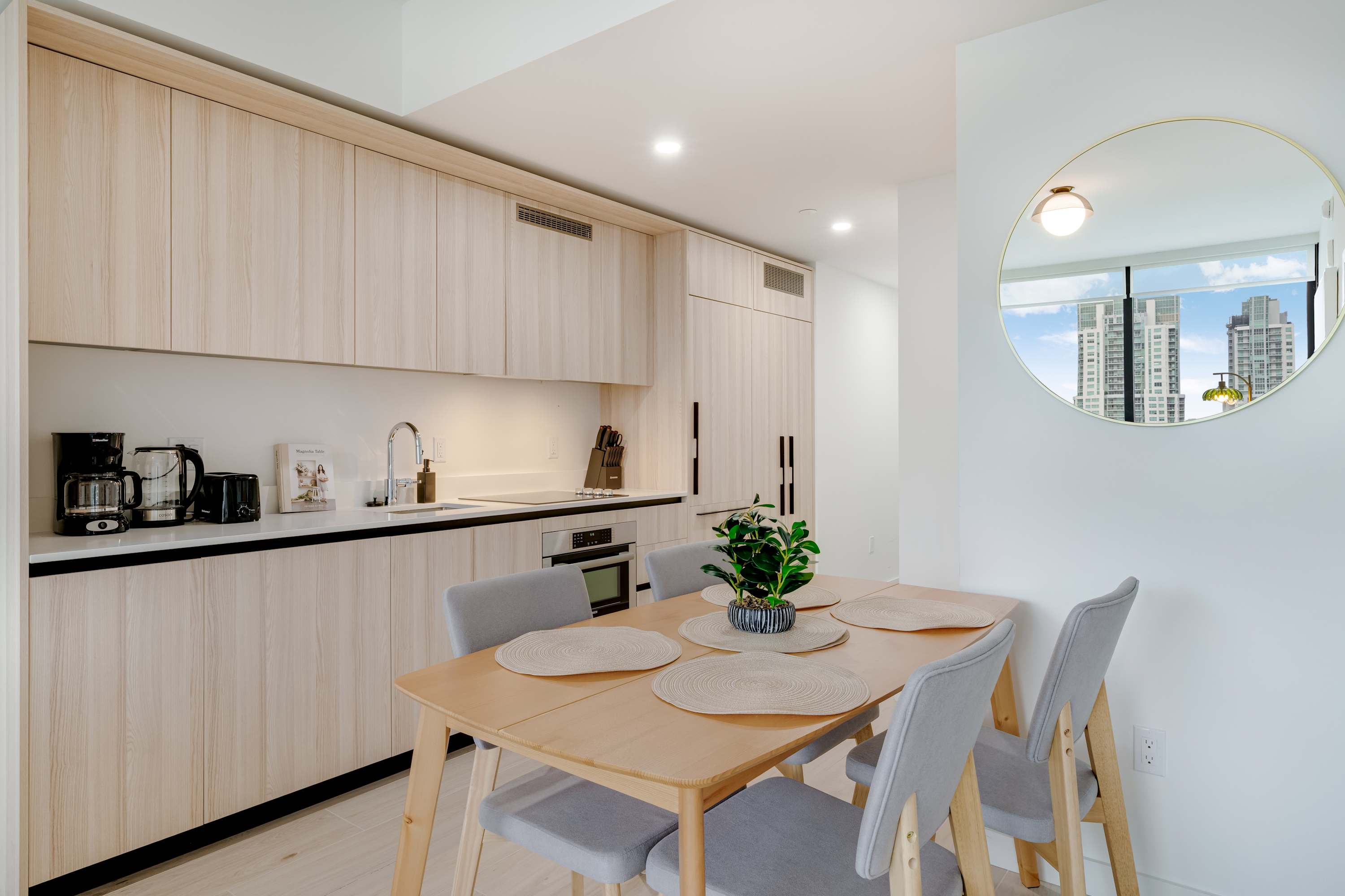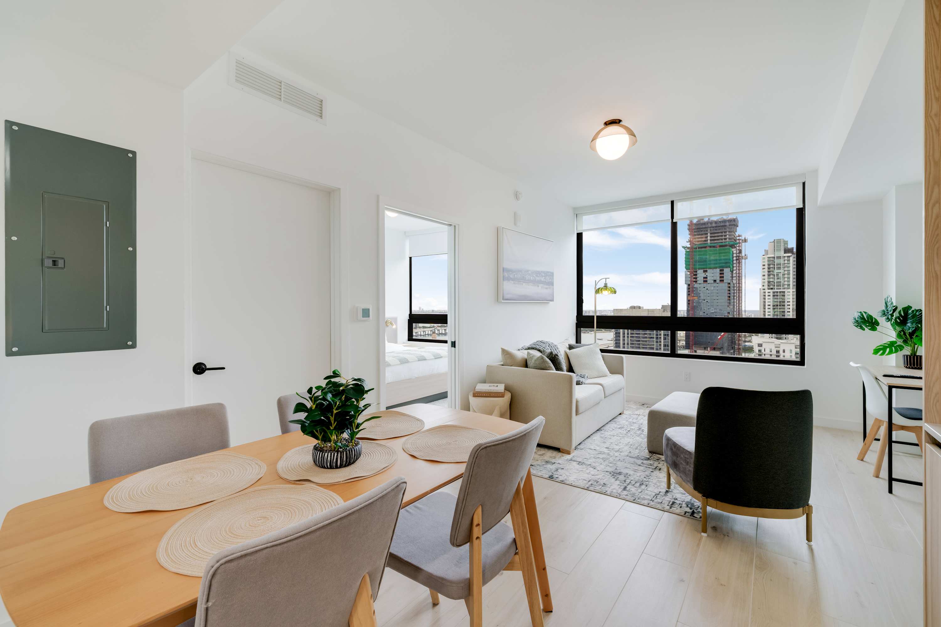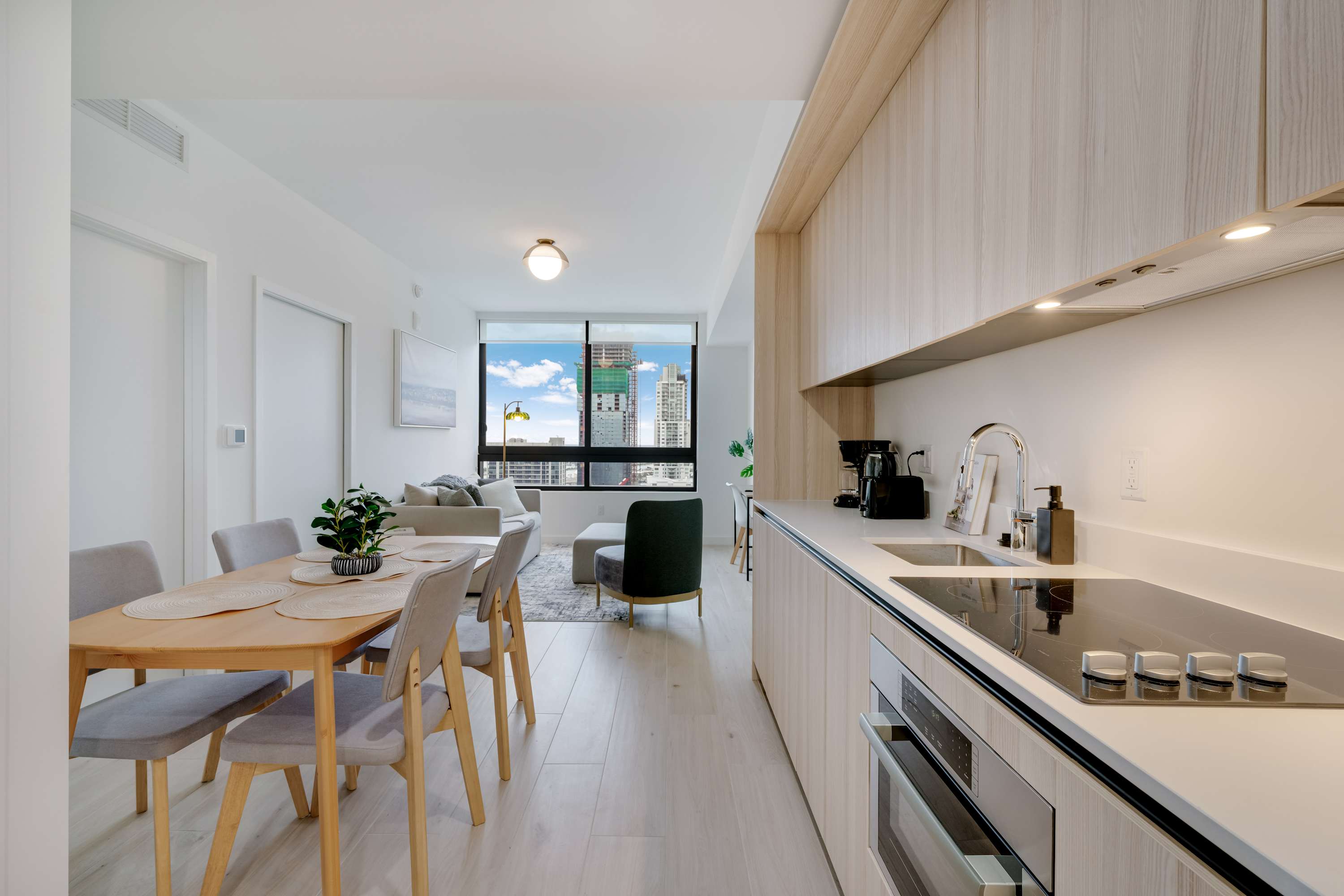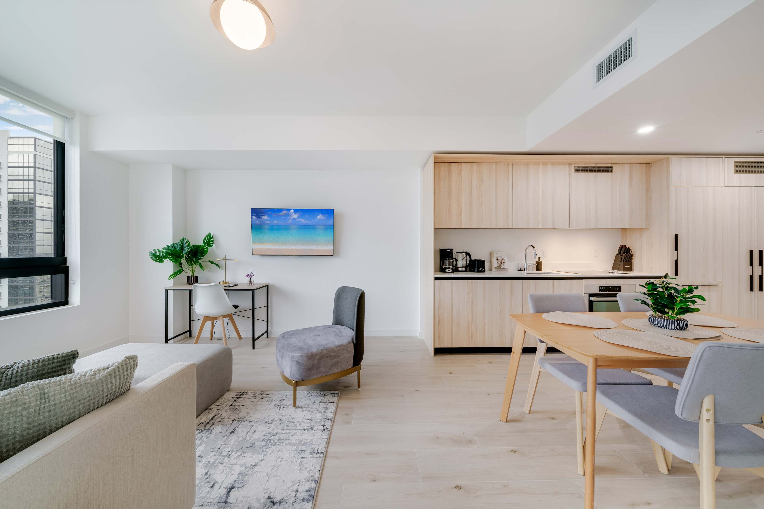 ★ LIVING ROOM: Features a sofa bed for additional accommodations. Smart TV and large windows with lots of natural light and views. Open concept to the kitchen with a dining table in between the spaces.