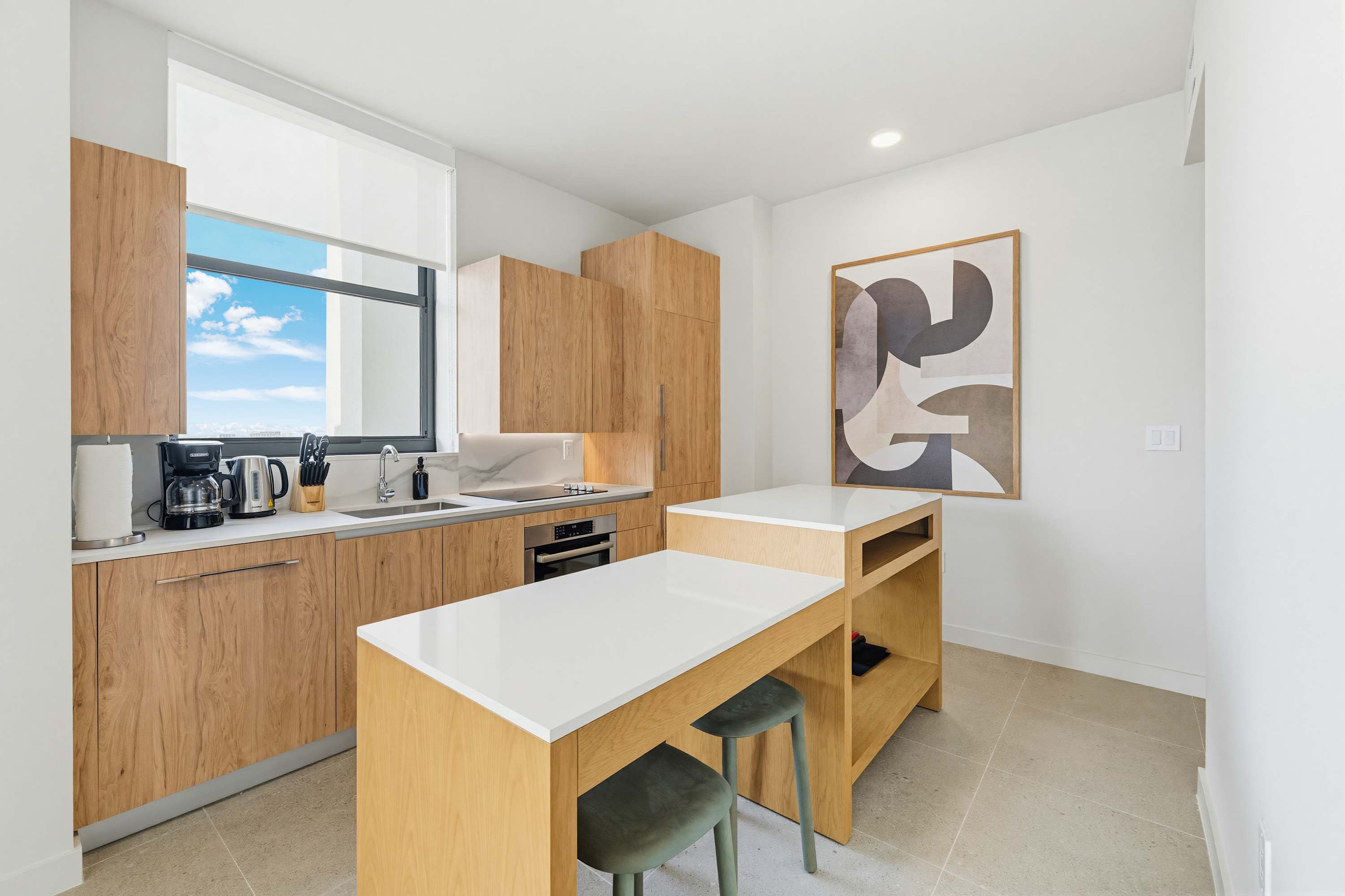 Equipped with modern appliances, including a full-size fridge, oven, stove, coffee machine, electric kettle, toaster, and essential cookware.