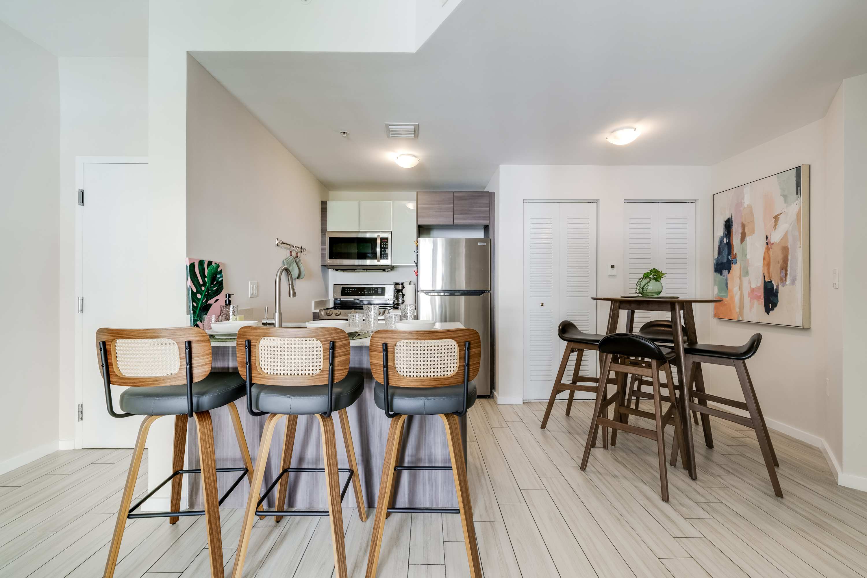 A stylish and comfortable living space featuring a cozy sofa for ample seating and a Smart TV, seamlessly connected to an eat-in kitchen with a charming bistro table.