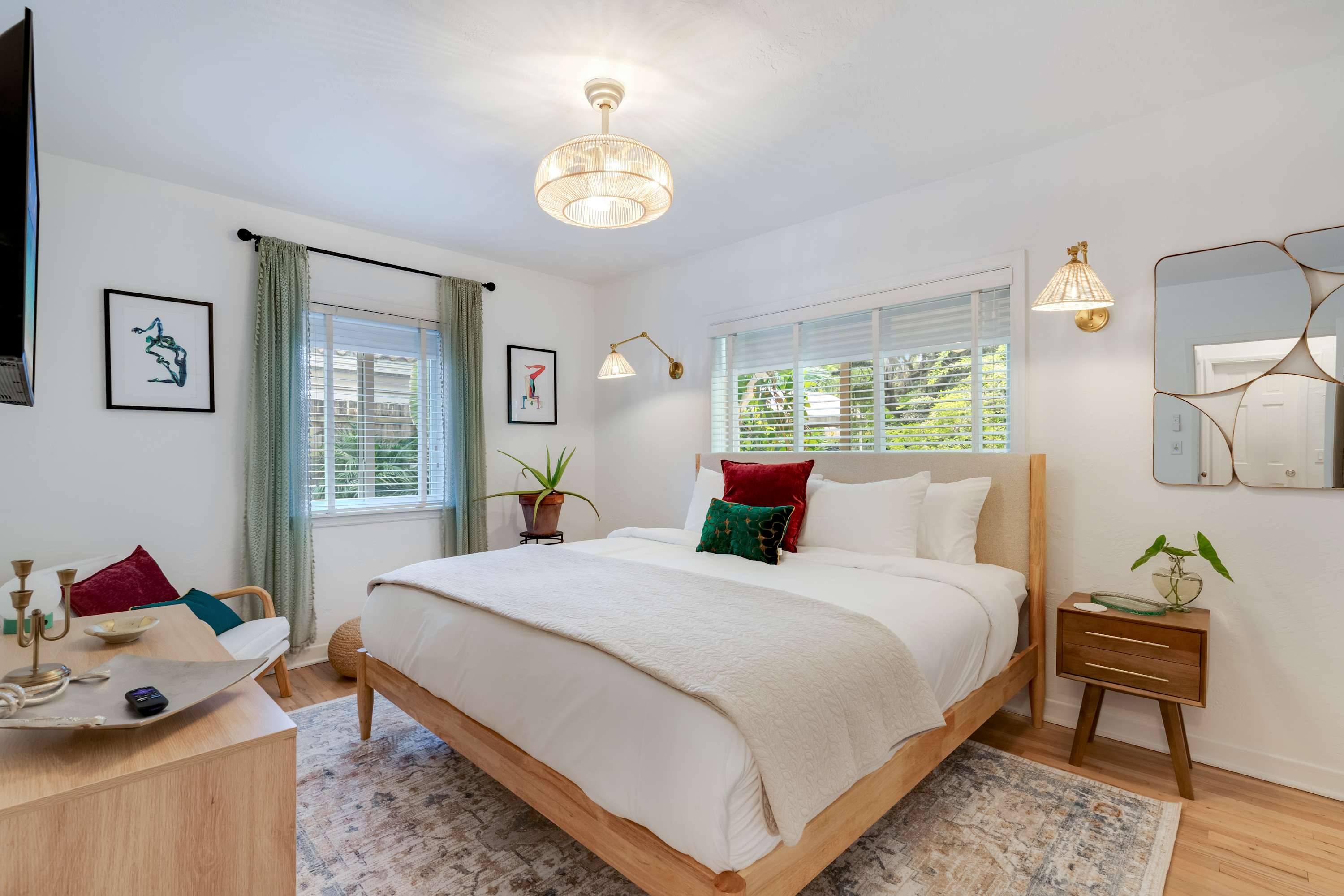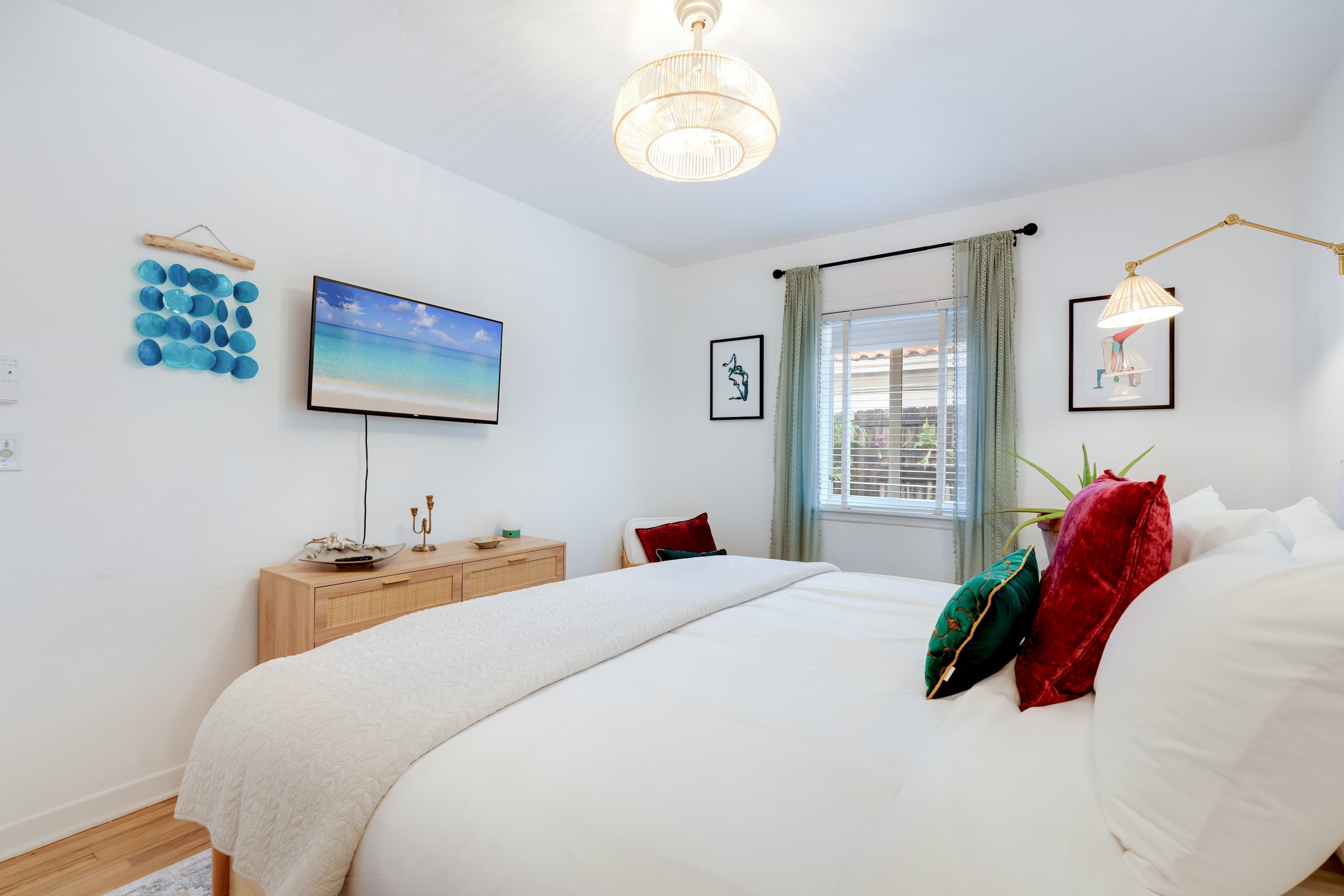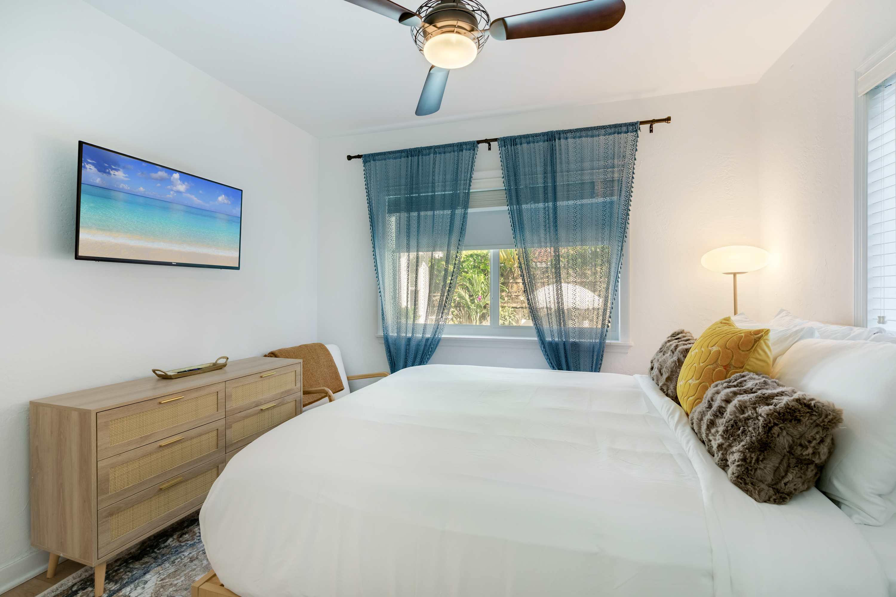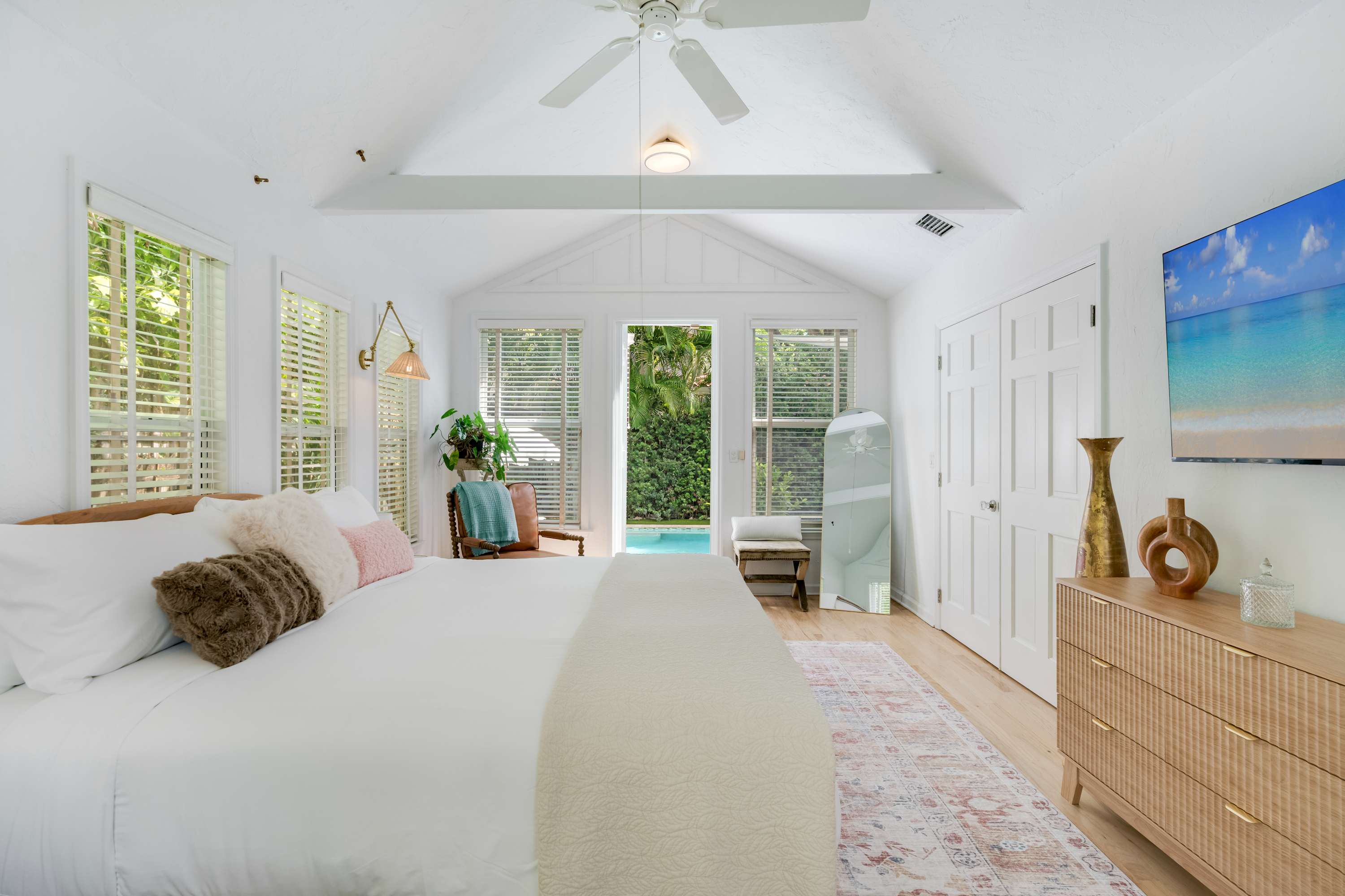 Features a king bed, TV, and ample storage space.