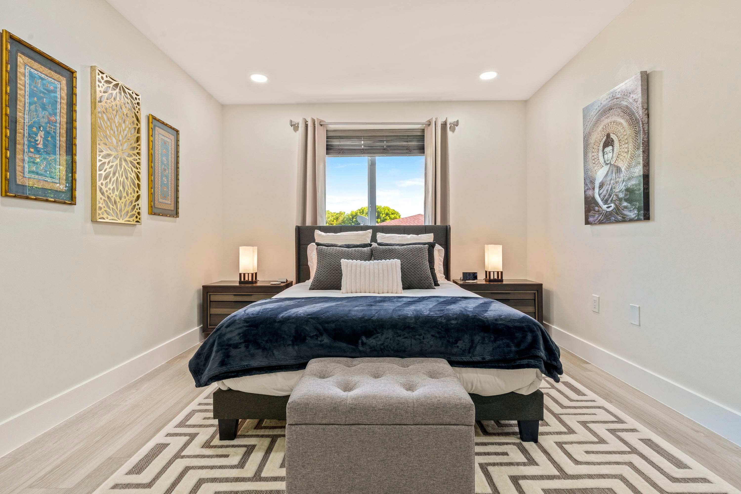 Features a queen-size bed, a Smart TV, desk, and ample storage space.
