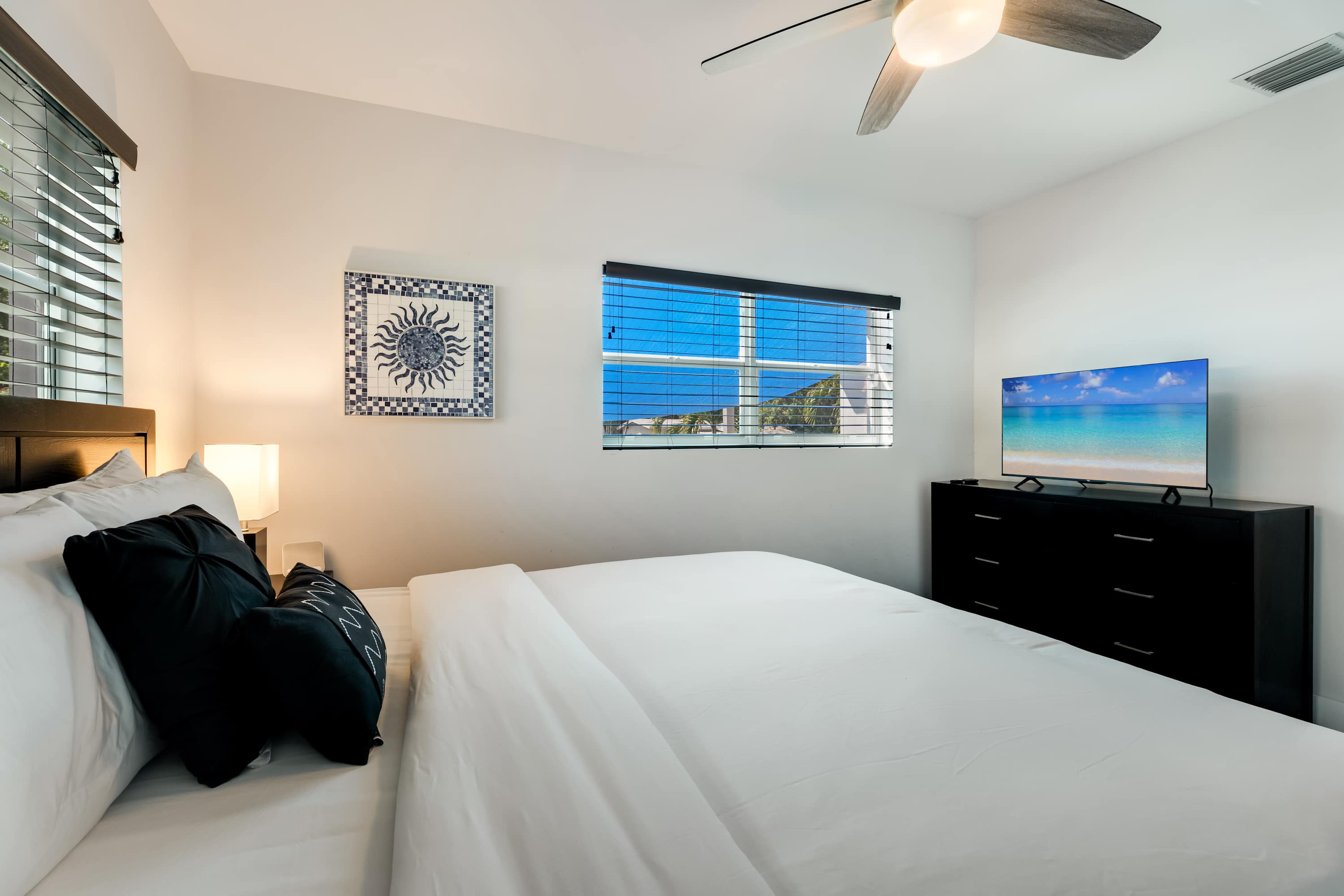 A tranquil space featuring a king-size bed, Smart TV, and an ensuite bathroom with a modern shower. Thoughtfully designed for comfort, it also offers ample closet space and a relaxing atmosphere. Perfect for unwinding after a long day.