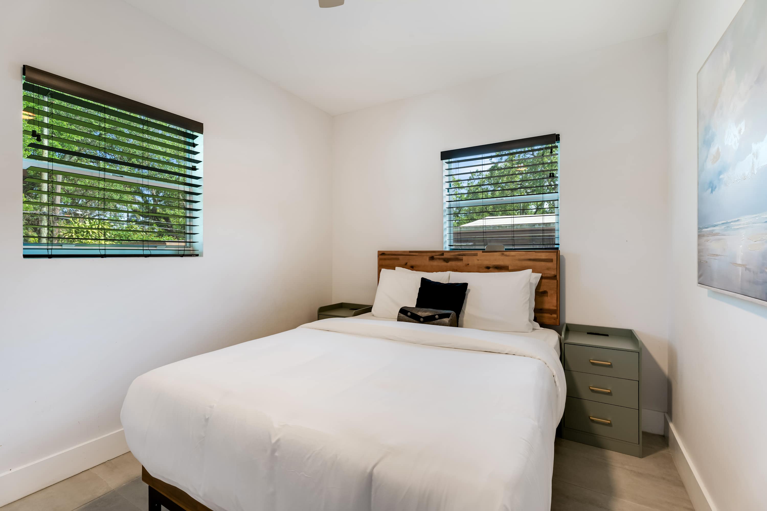 Features a queen-size bed in a comfortable and inviting space, perfect for a restful night’s sleep. The room offers ample storage and easy access to a nearby shared bathroom.