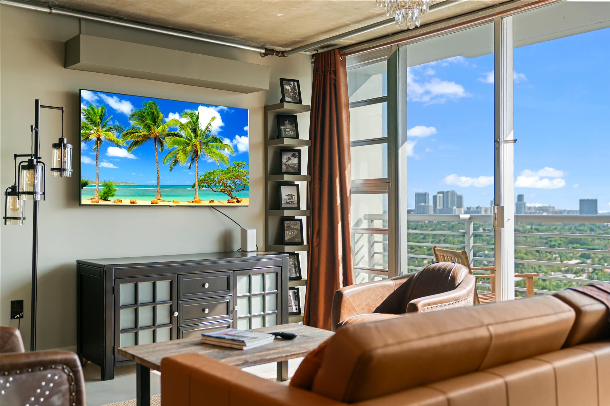 The living space pairs modern comfort with statement design. Sink into plush seating, unwind with a Smart TV and Xfinity cable, or gather around the custom motorcycle bar for an evening in. An electronic dartboard adds a playful touch, while dimmable lighting shifts the mood from day to night. Step onto the balcony for sweeping views, equally striking in sunlight or after dark. The sofa backrest flattens to a bed, for additional sleeping accommodations.