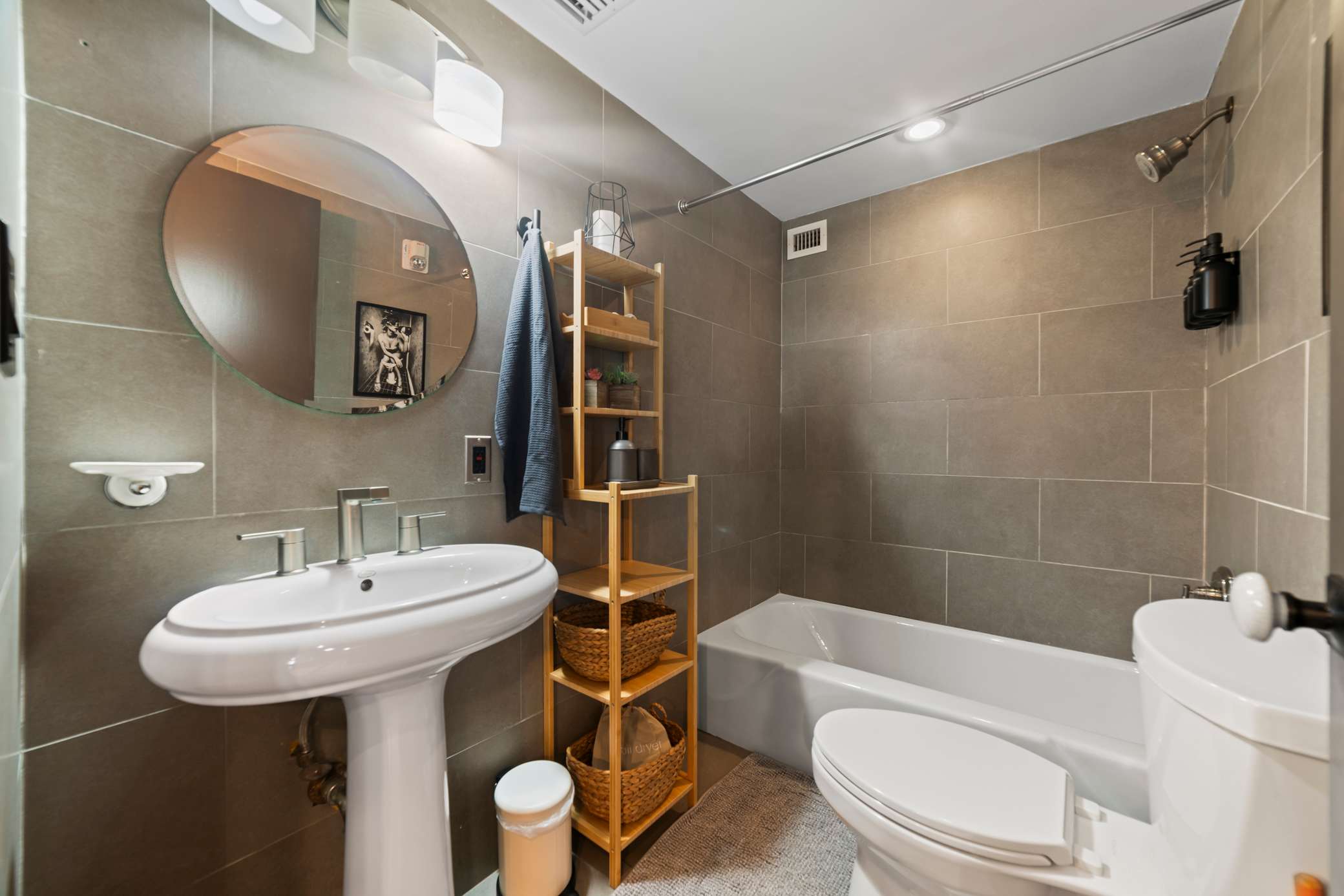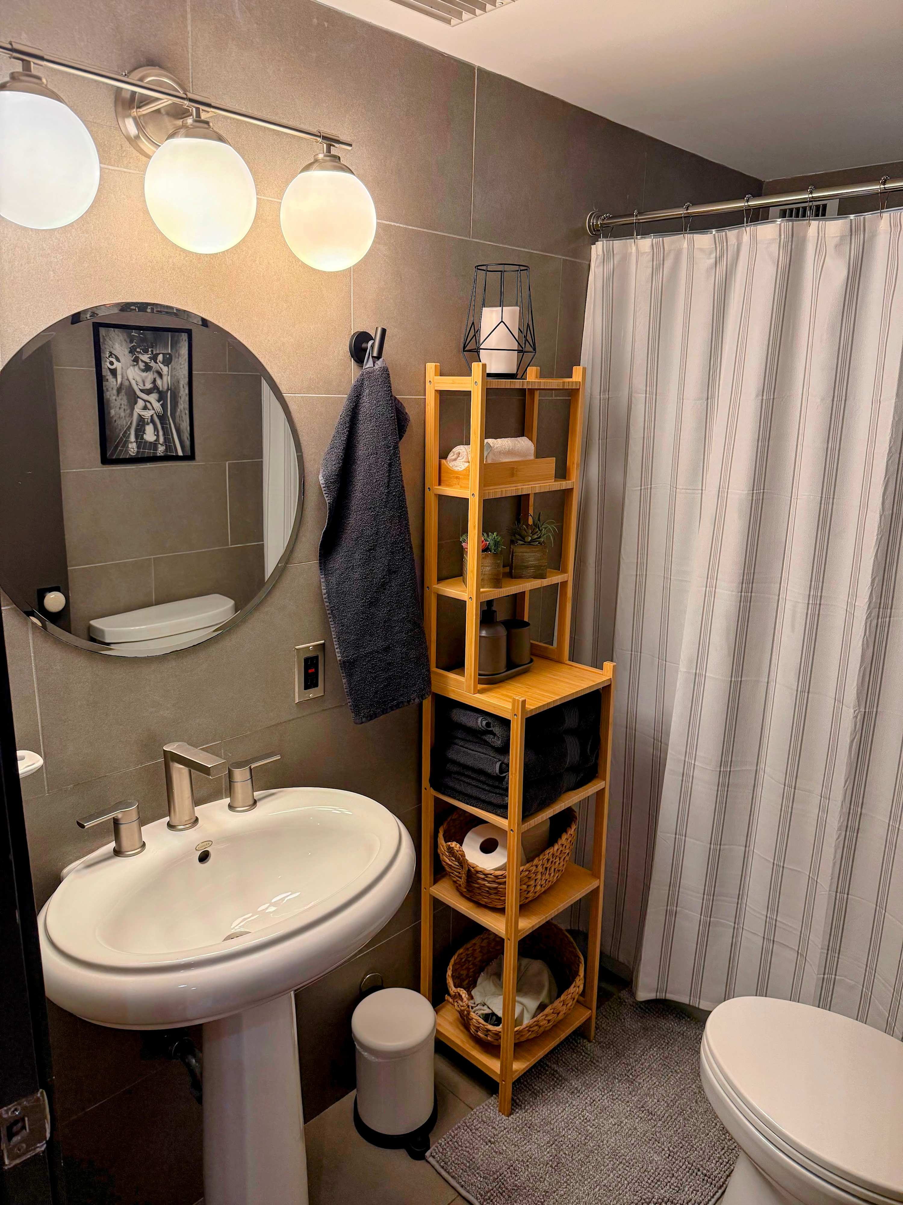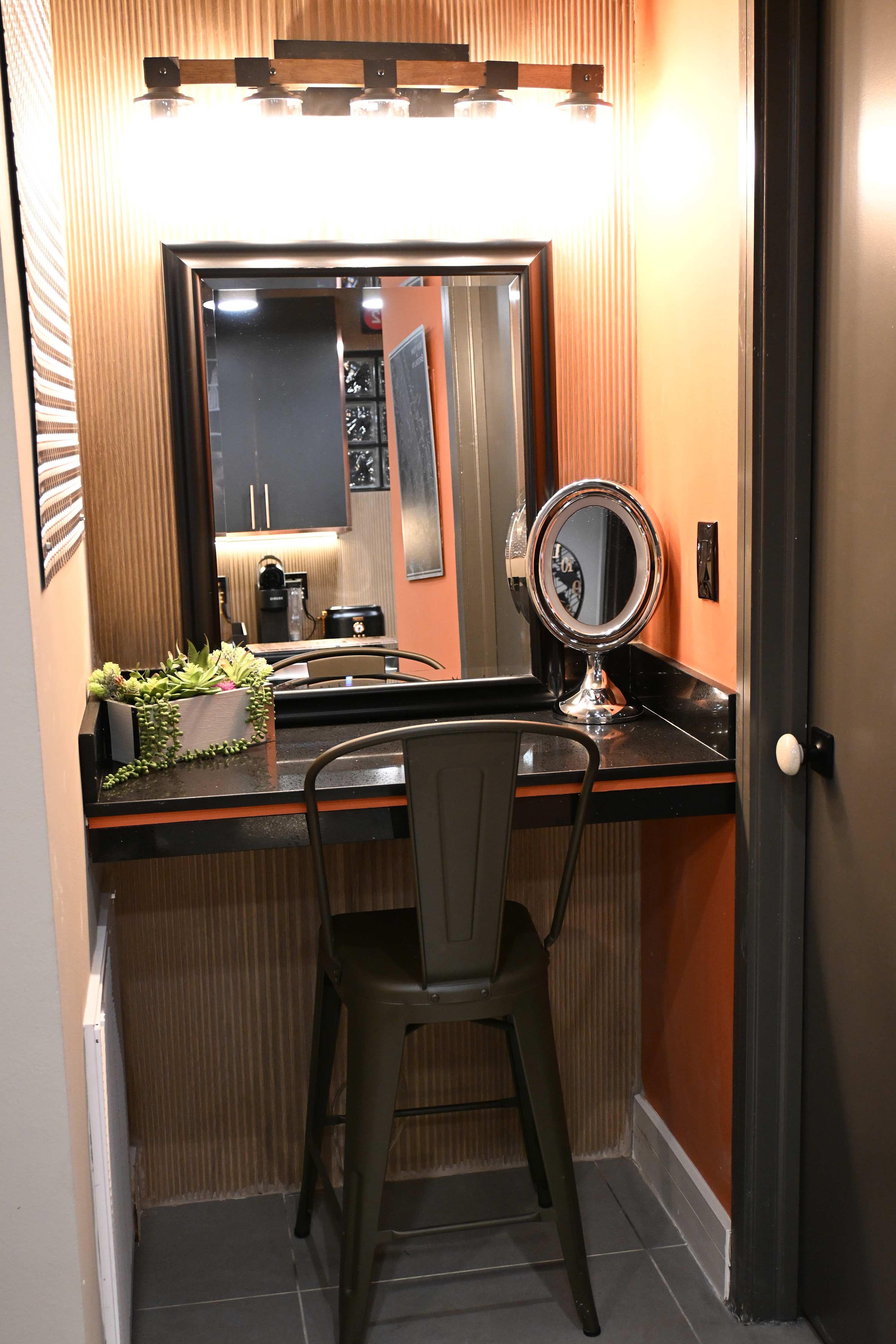 Two thoughtfully designed bathrooms offer a calm, considered escape. The primary en suite reflects a sleek, modern loft aesthetic, while the main bathroom features refined tilework and is fully stocked with fresh towels and essentials. Just beyond, a dedicated makeup station adds a touch of ritual, perfect for getting ready before a night out or an easy morning by the coast.
