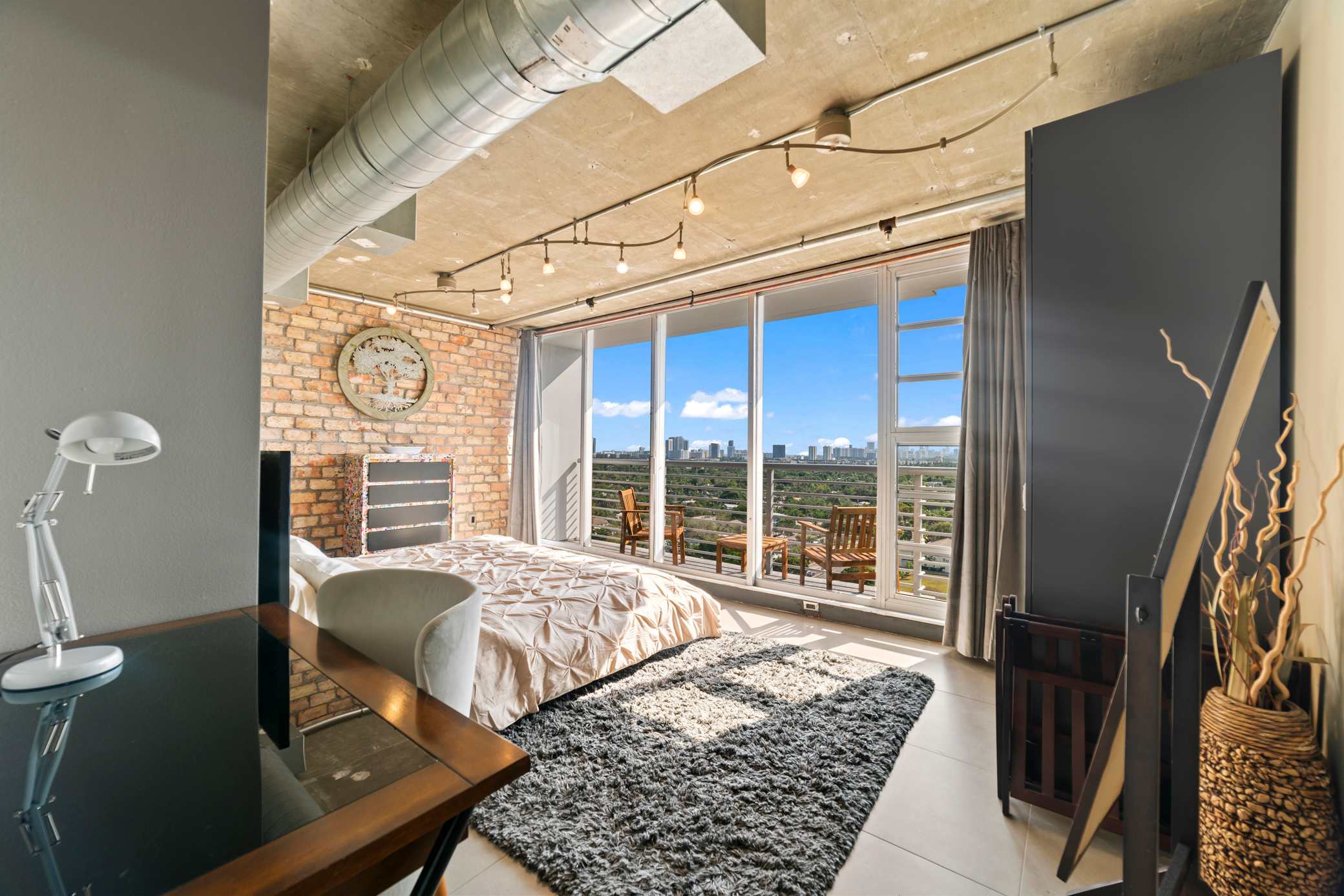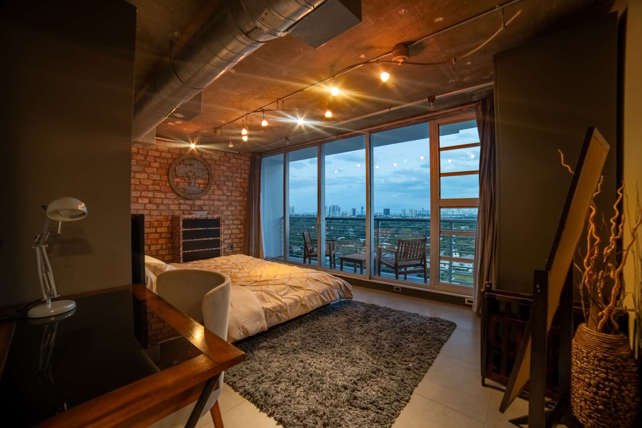 The exposed brick feature wall set a refined, urban tone with velvet blackout curtains for privacy and deep rest. The king bed anchors the space, complemented by a designer dresser and an armoire closet with soft automatic lighting. Enjoy a quiet workspace with a desk perfect for focused work. Dimmable ceiling lights shape the mood from calm to cinematic. Step onto your private balcony or linger in bed as sunrise and sunset unfold just beyond the glass.