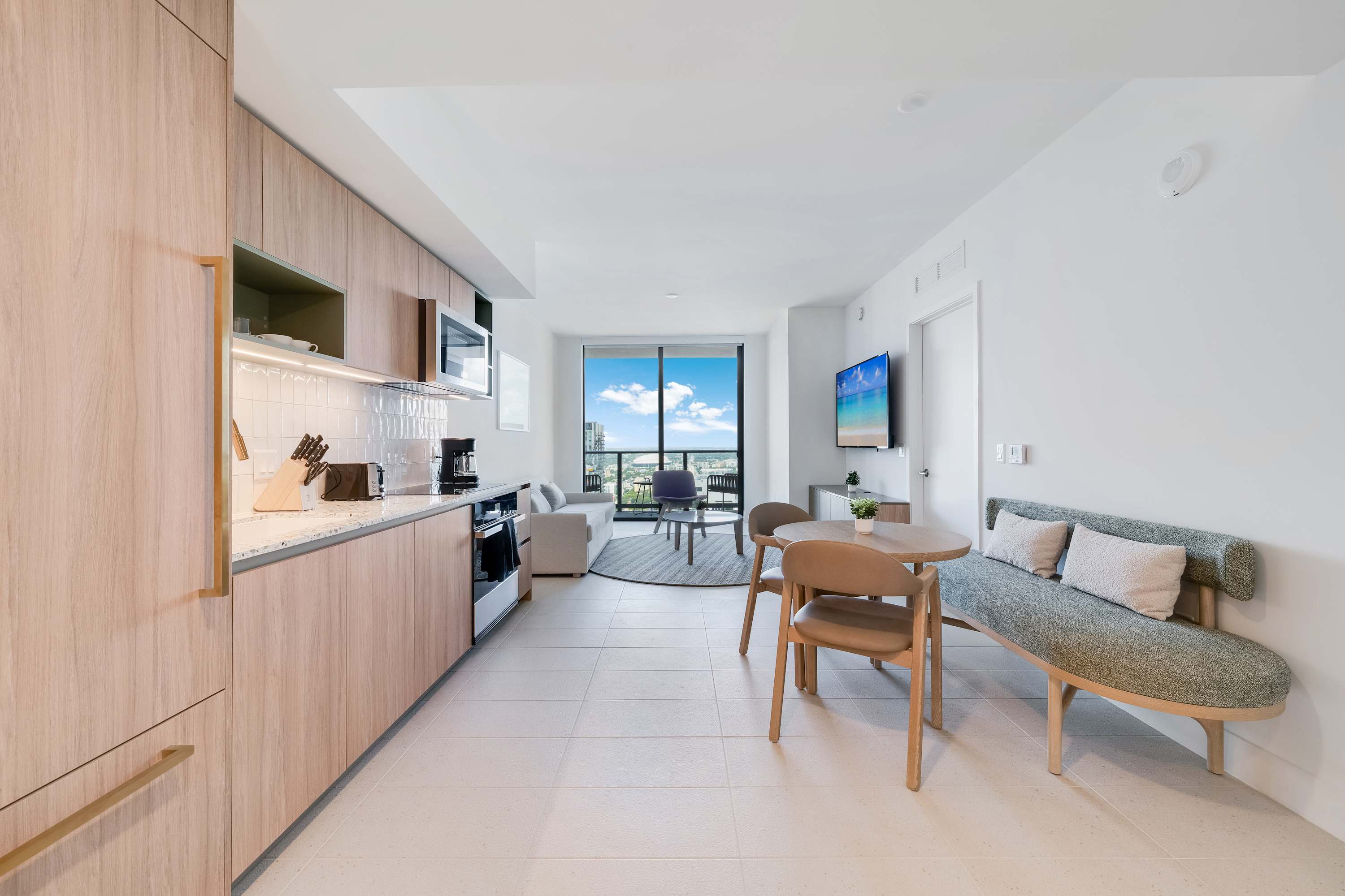 ★ LIVING ROOM: Features a sofa bed for additional accommodations. Smart TV and floor to ceiling windows with lots of natural light and views. Open concept to the kitchen with a dining table in between the spaces.