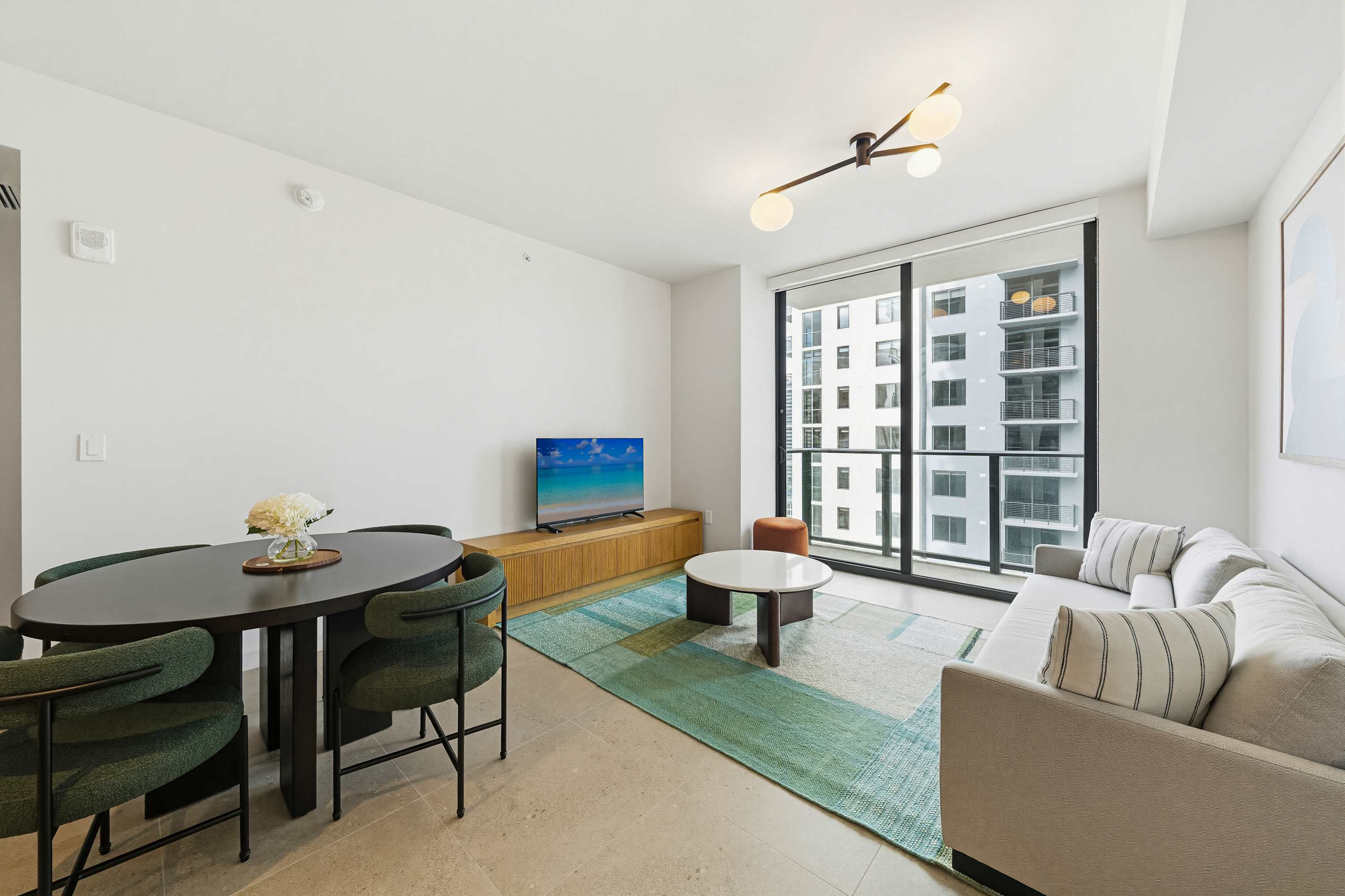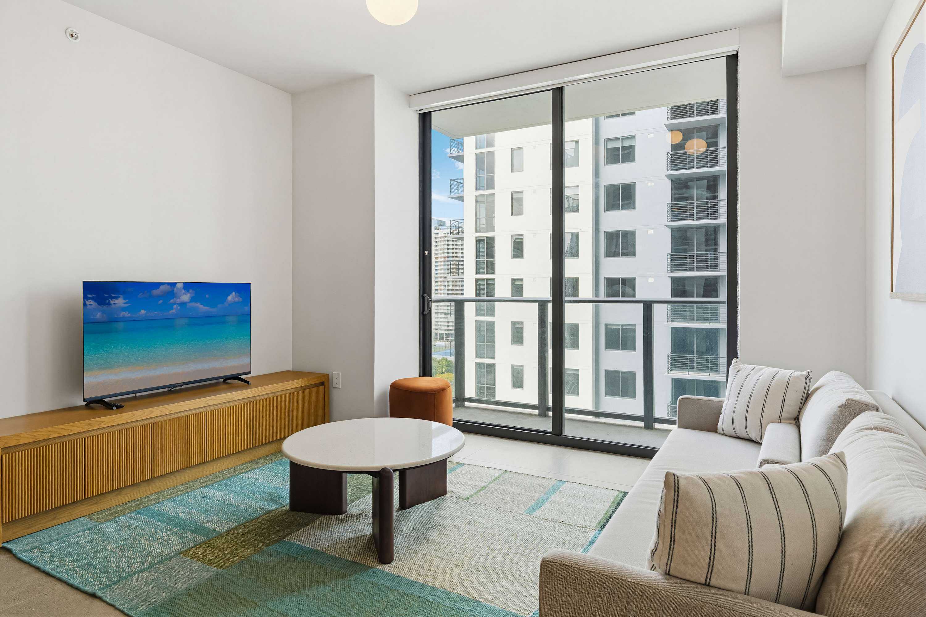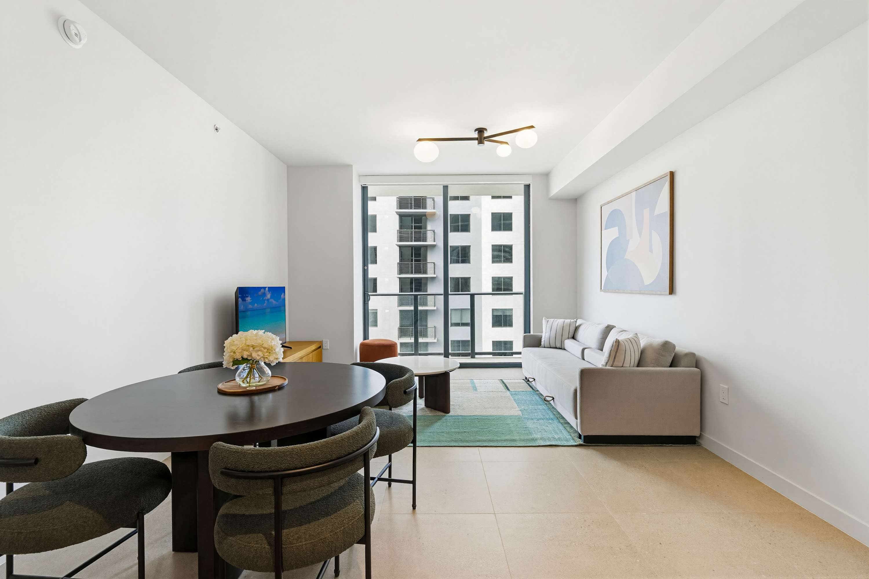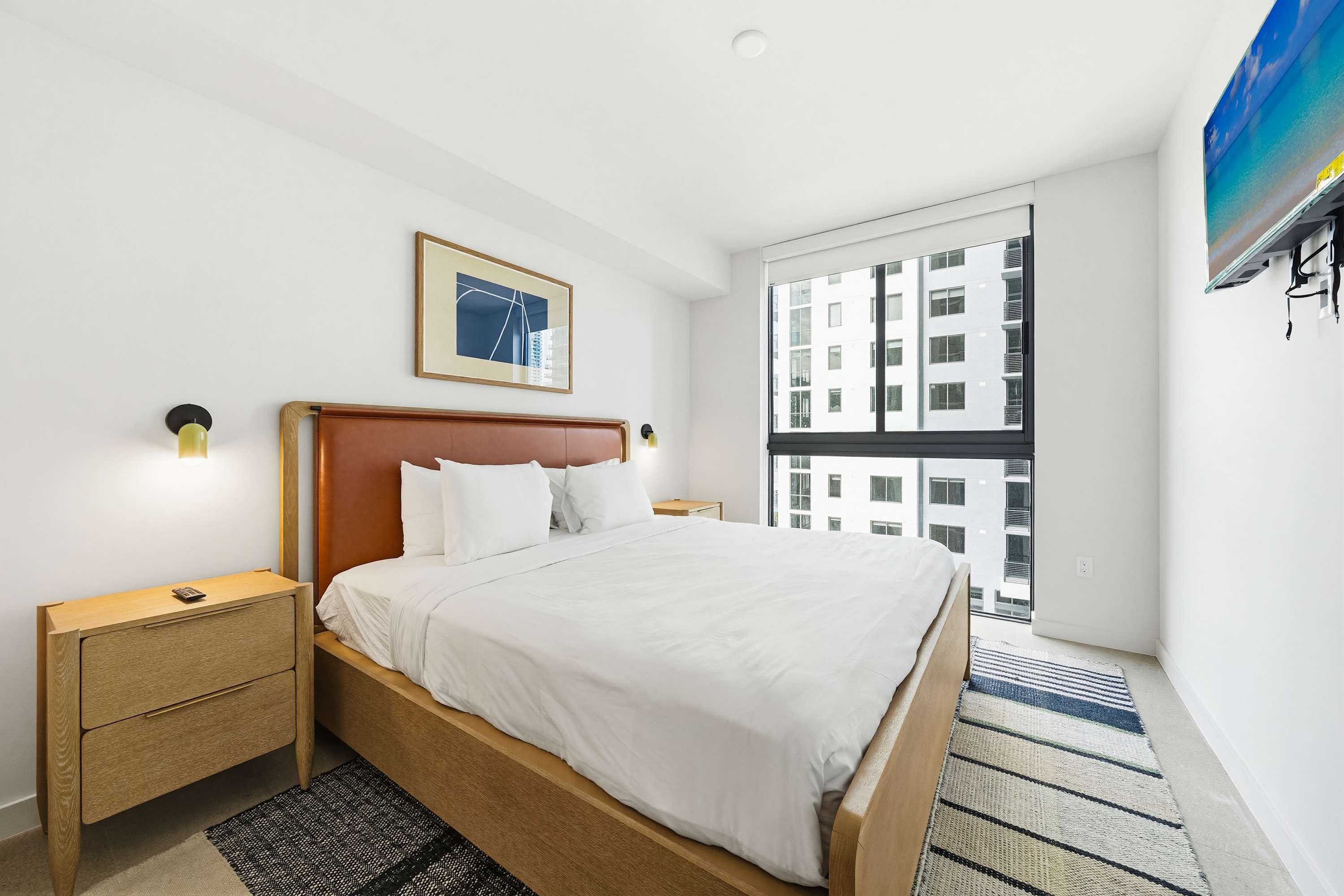 Step into a thoughtfully styled city retreat where modern design meets quiet elegance. Sun-filled interiors, refined finishes, and sweeping city views set an easy, calming tone. Enjoy top-tier rooftop amenities, a bright open living space, serene bedroom with plush bedding, spa-inspired baths, and a breezy balcony perfect for morning coffee. A polished downtown escape you’ll want to return to.