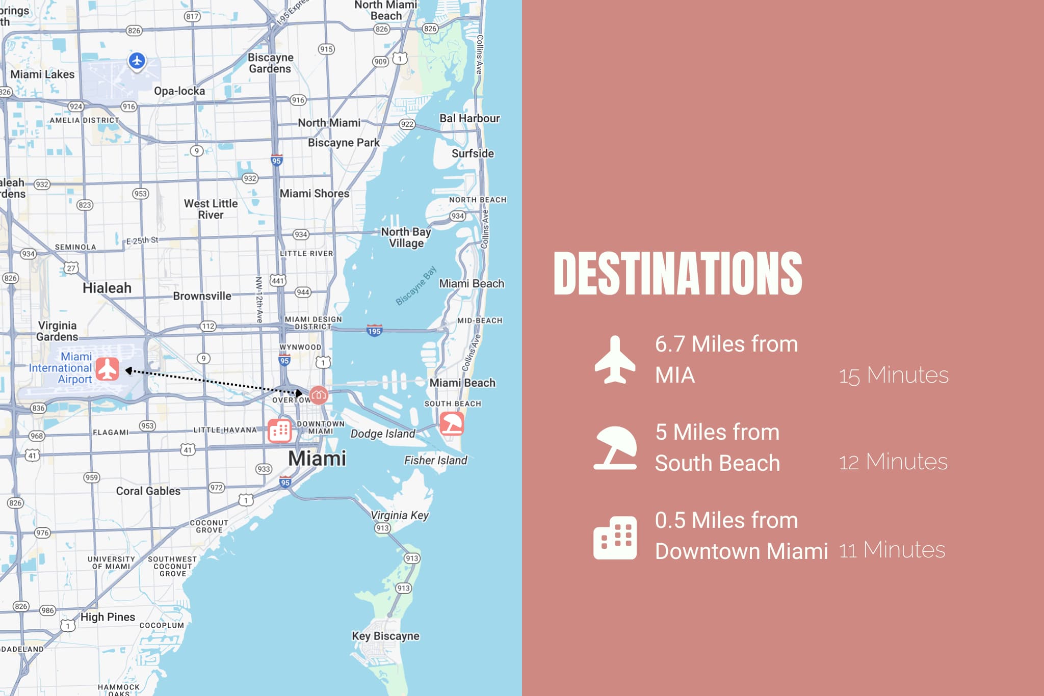 By car, Brickell City Centre is only 10 minutes away, the Design District and South Beach are about 20 minutes, and Miami International Airport is around a 20-minute drive. There is a free metro mover train right in front that goes to the museums as well as Brickell.