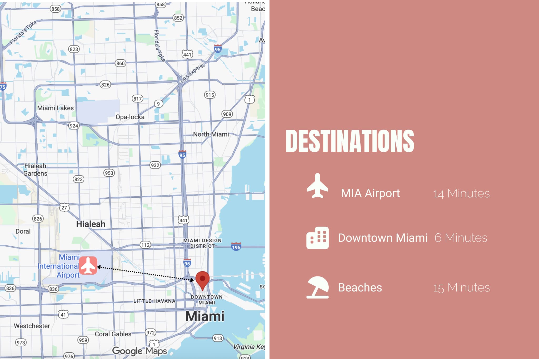 We suggest driving, but there is also a free metromover 3 blocks away. Uber/Lyft are affordable and convenient options.
