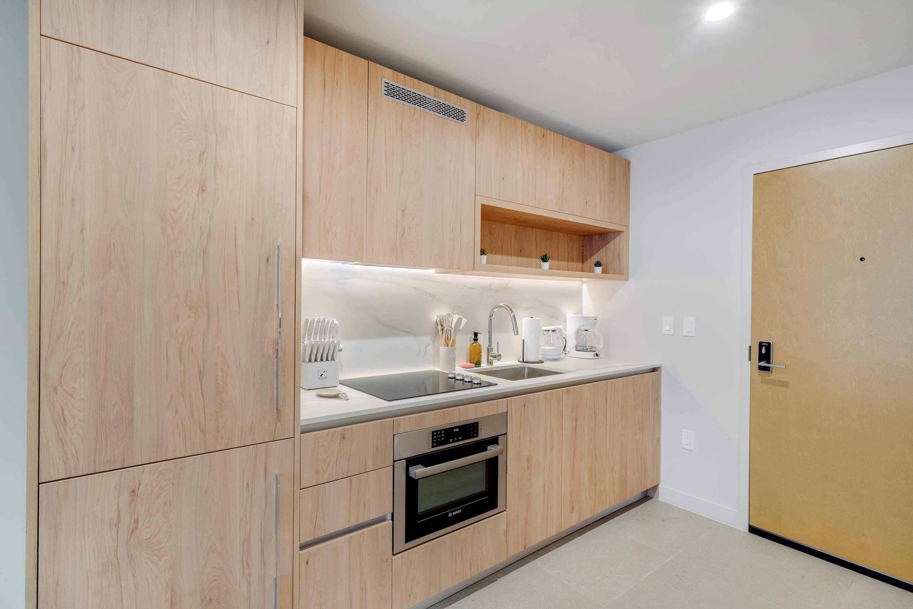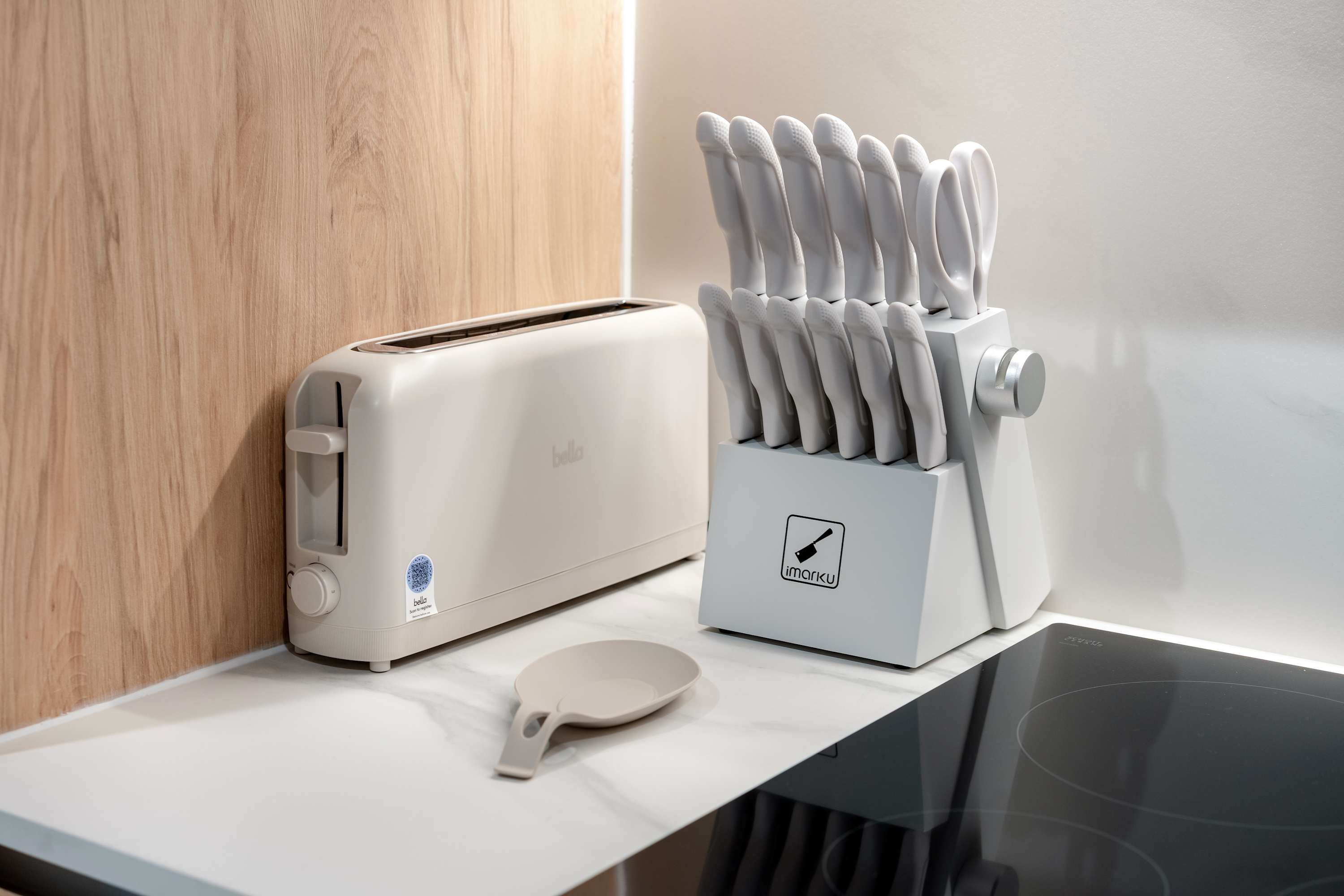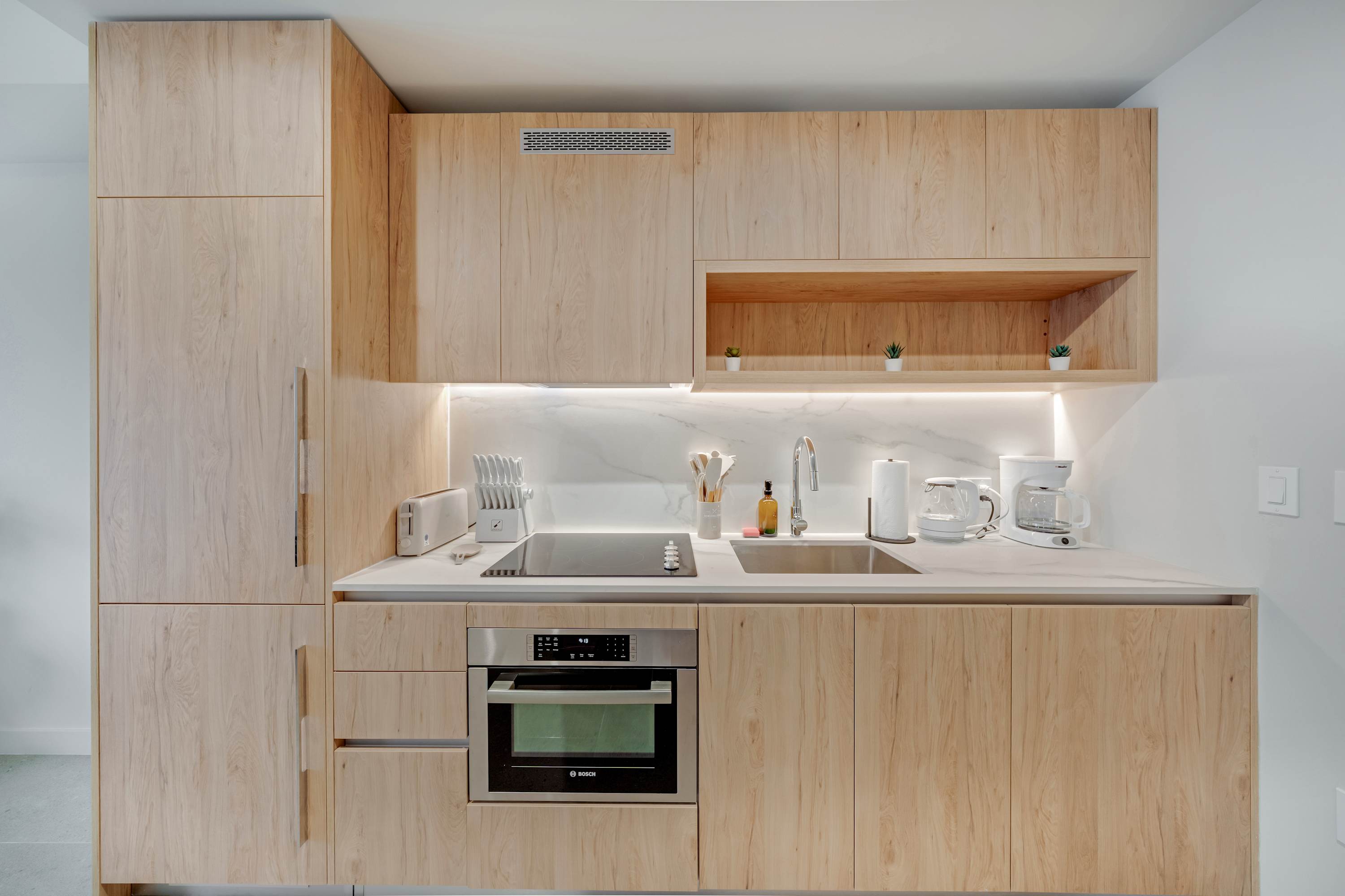 Equipped with modern appliances, including a full-size fridge, oven, stove, coffee machine, electric kettle, toaster, and essential cookware.