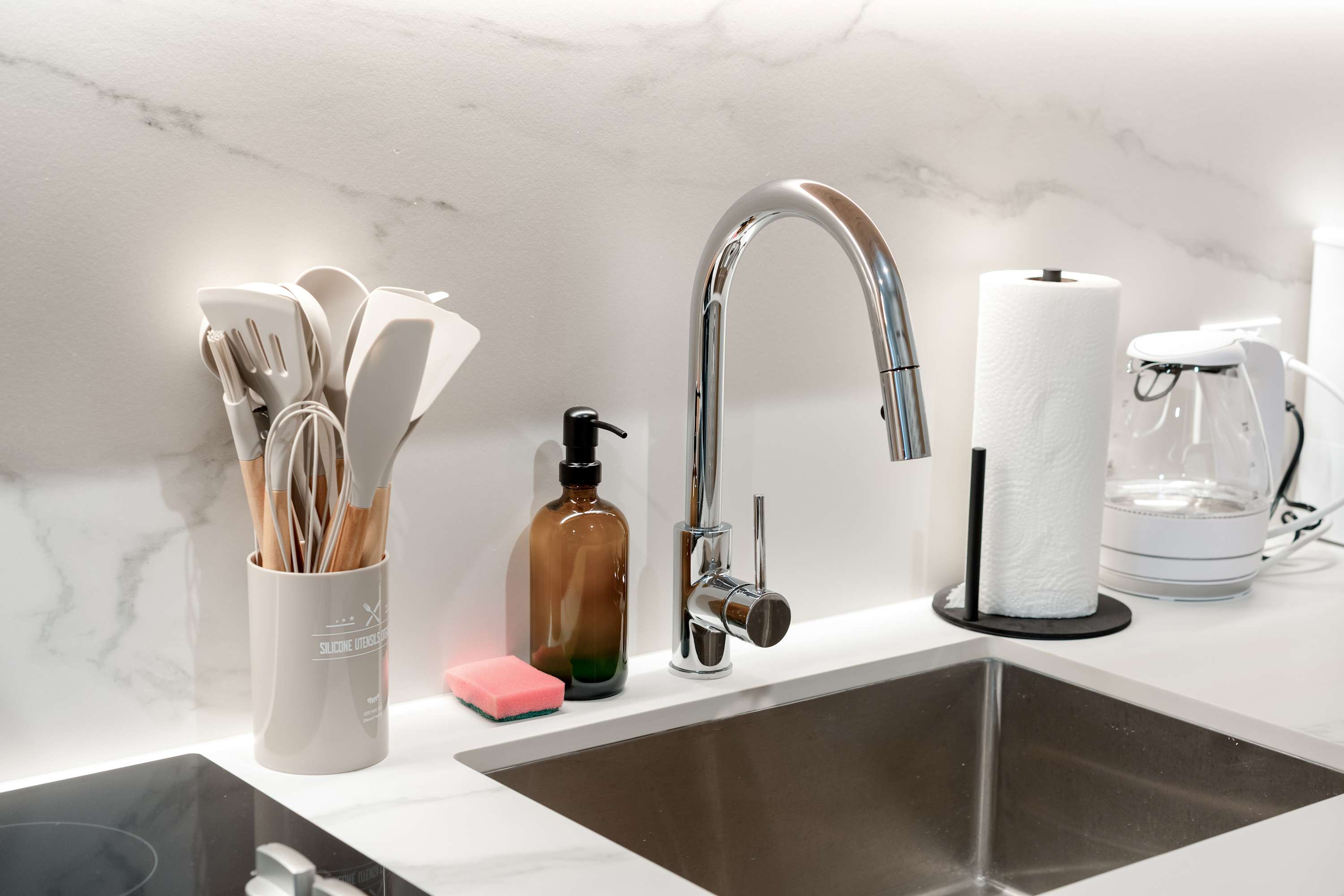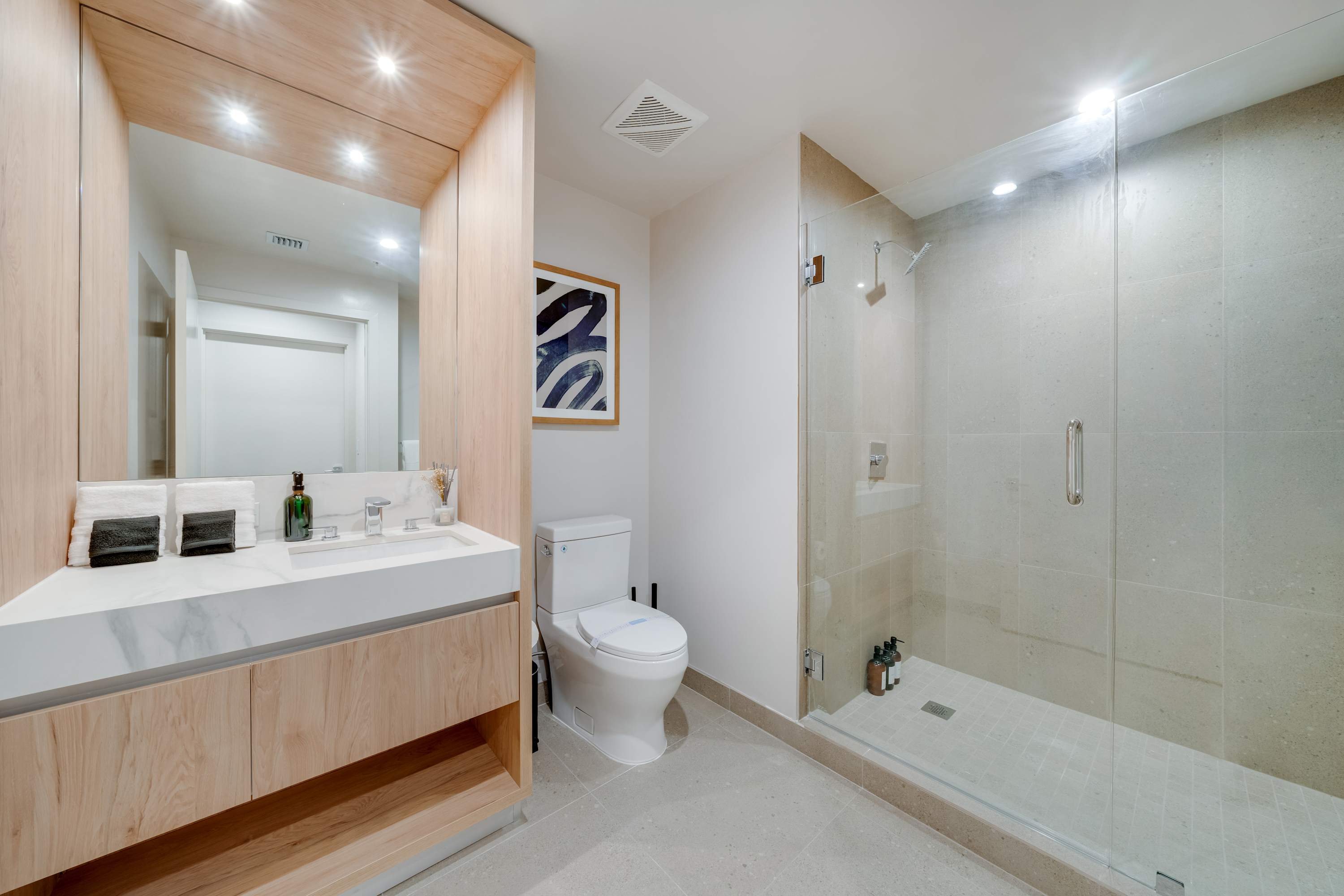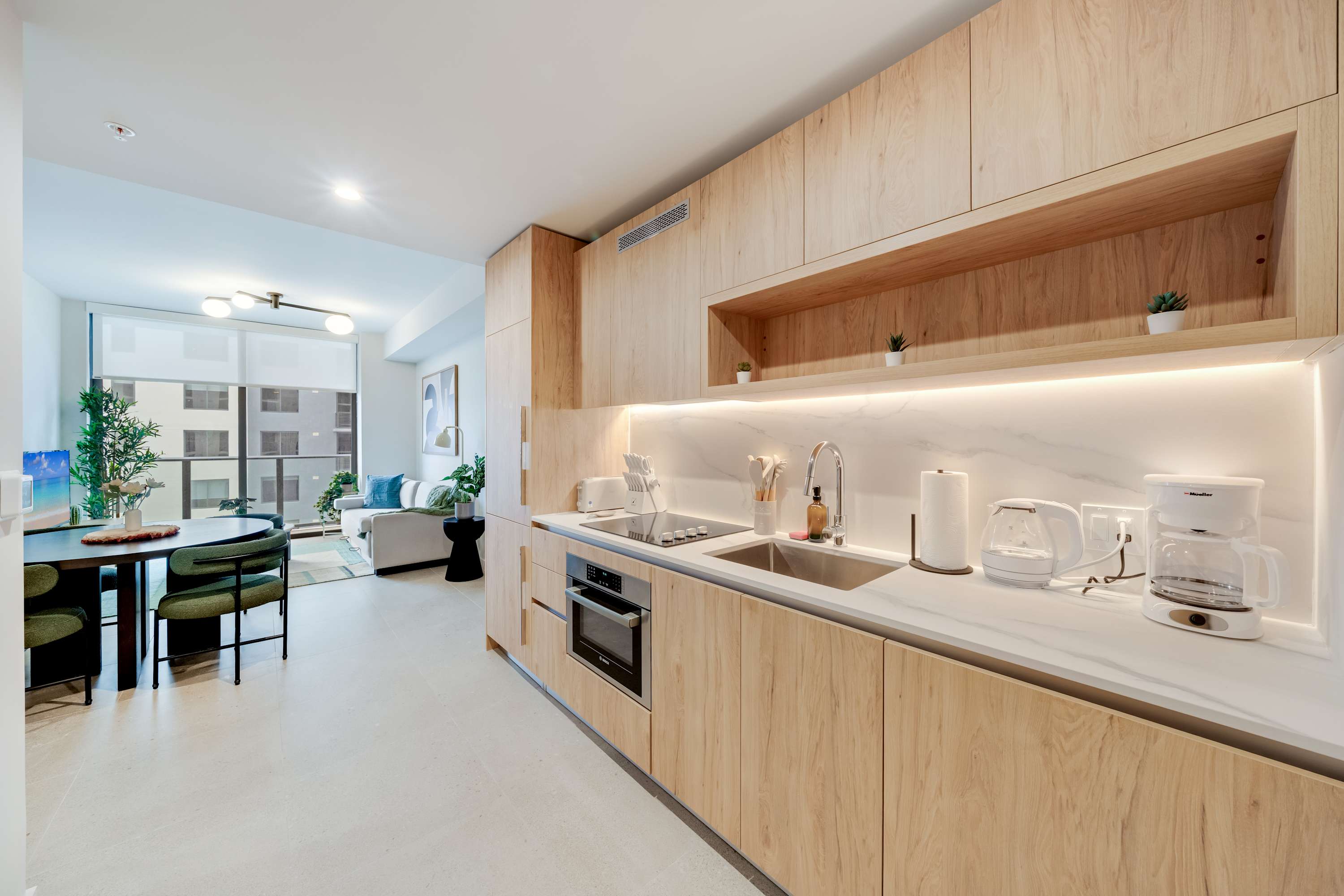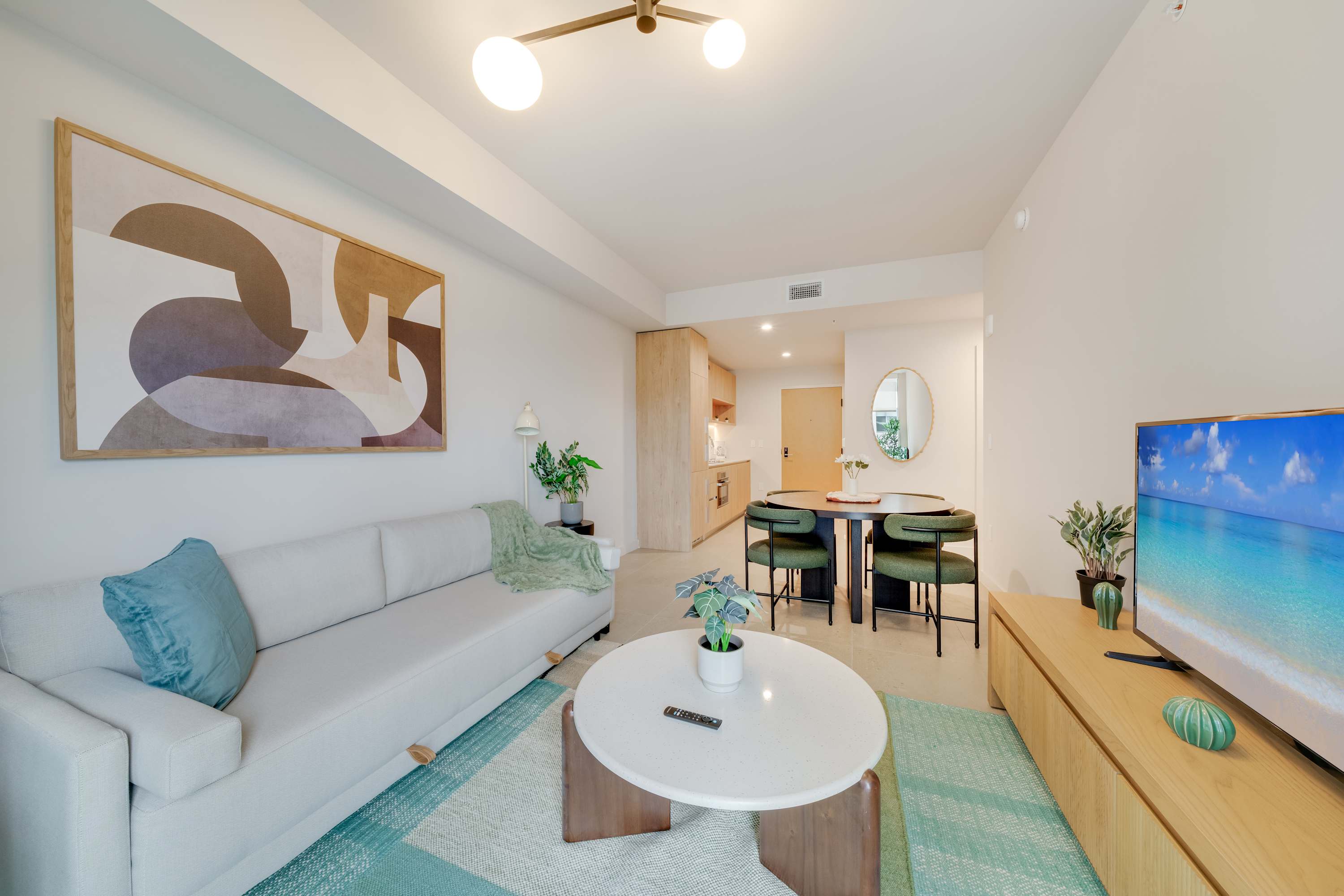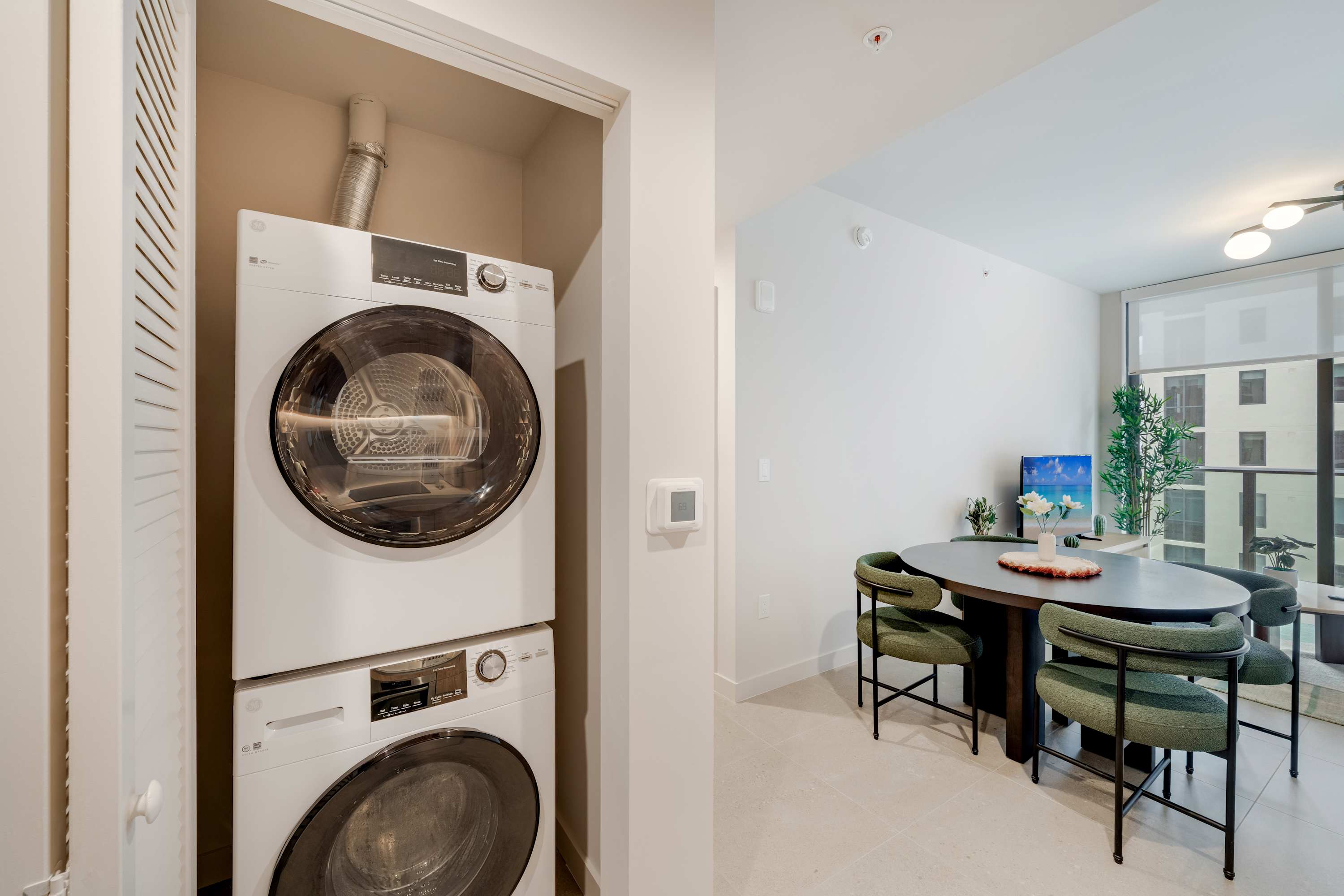 Includes WiFi, Smart TVs, ironing set, laundry facilities, and starter toiletries. Note: Washcloths and kitchen towels not included.