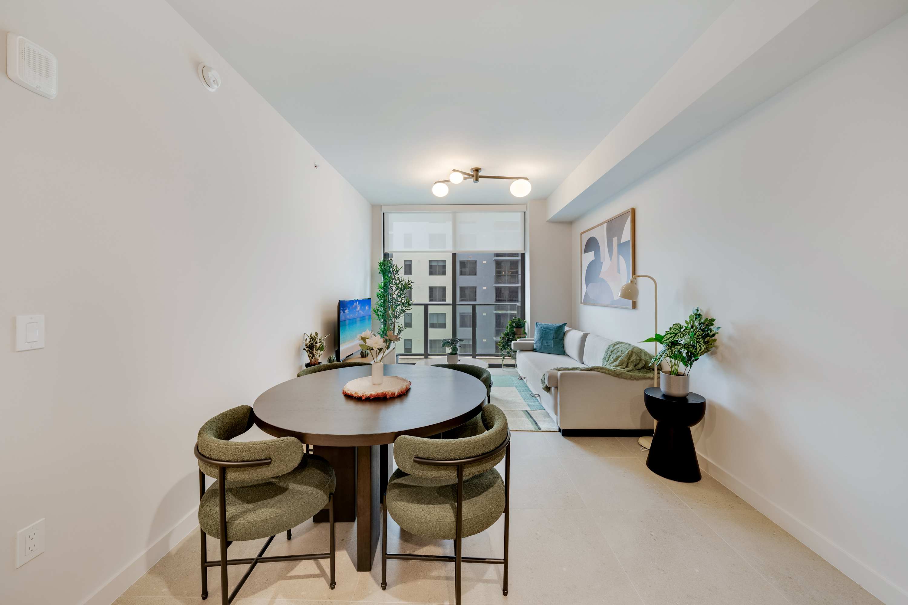 ★ LIVING ROOM: Features a queen sofa bed for additional accommodations and a Smart TV and large windows with lots of natural light and views. Open concept to the kitchen with a dining table in between the spaces.