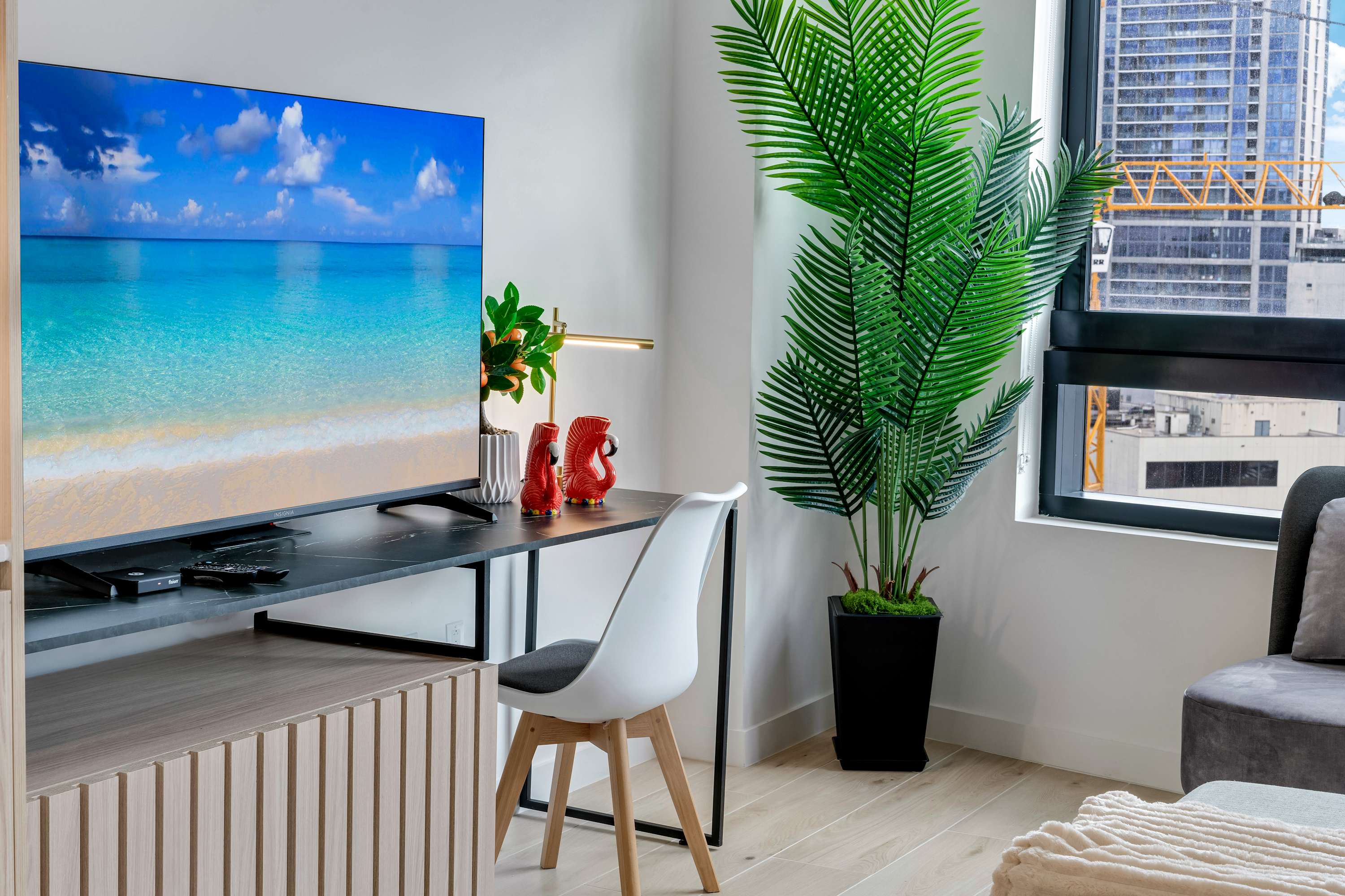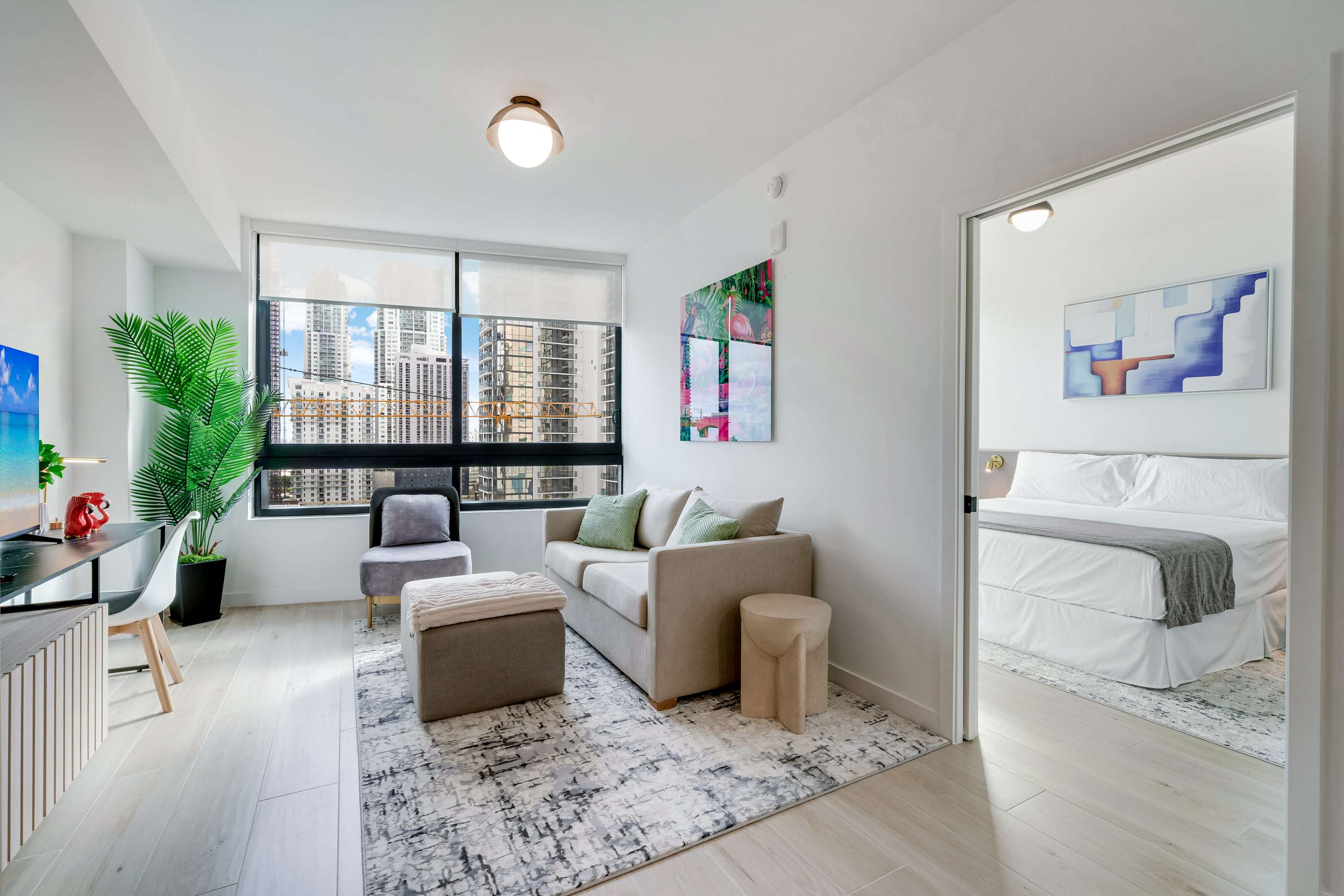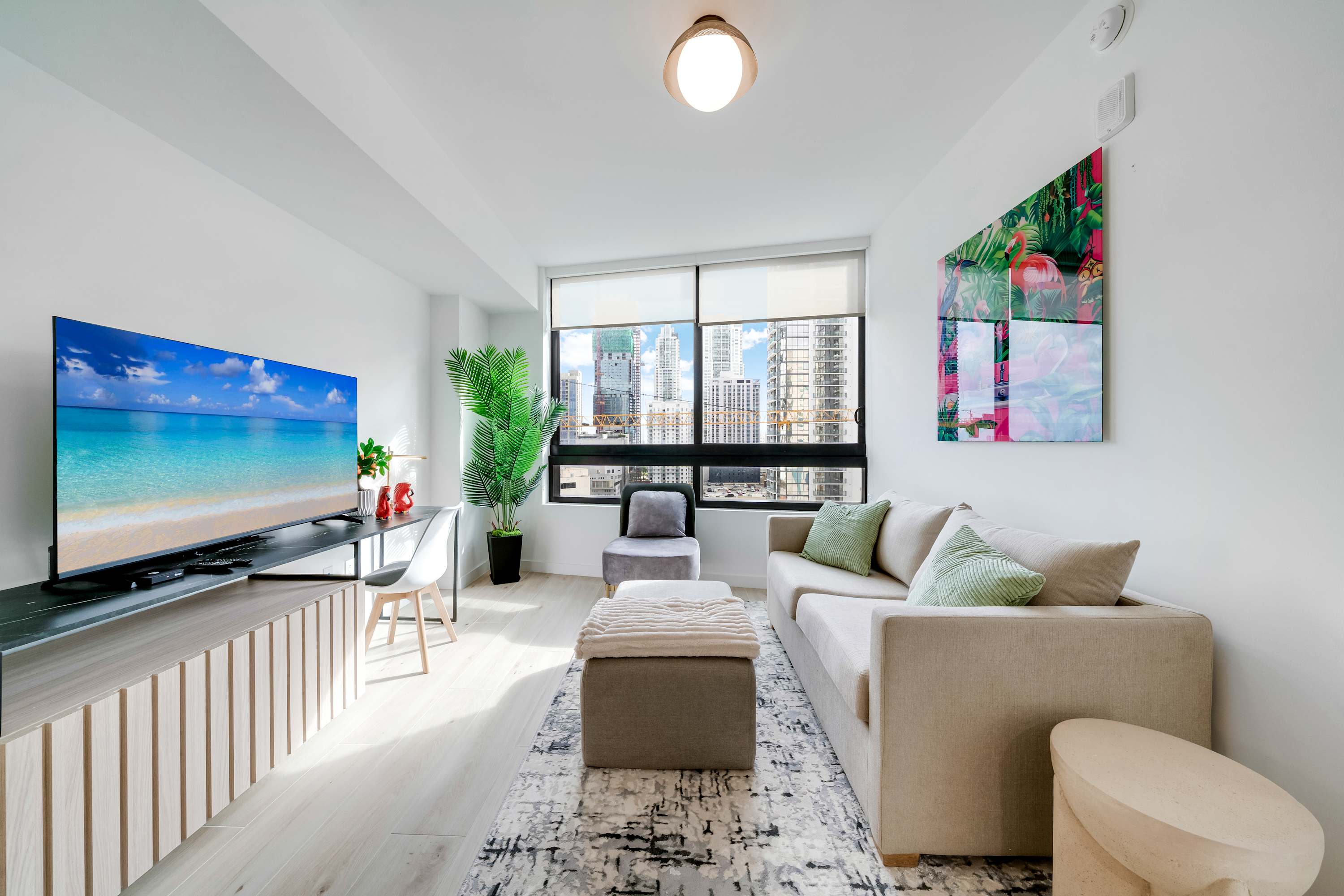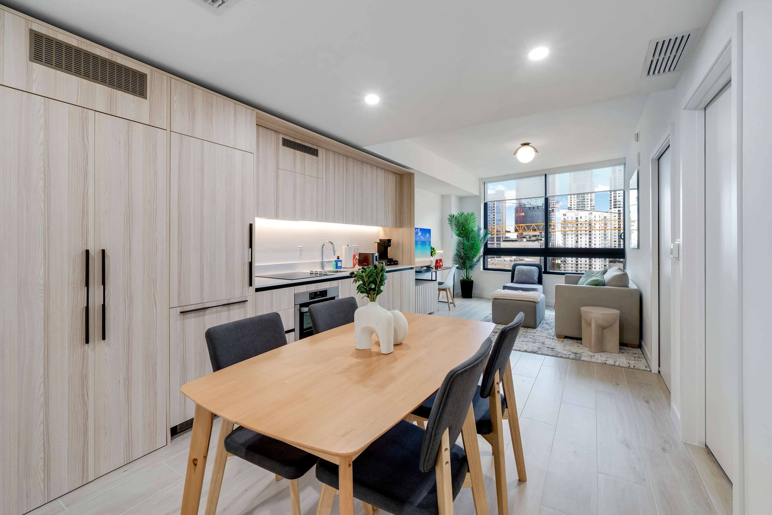 ★ LIVING ROOM: Features a sofa bed for additional accommodations. Smart TV and large windows with lots of natural light and views. Open concept to the kitchen with a dining table in between the spaces.