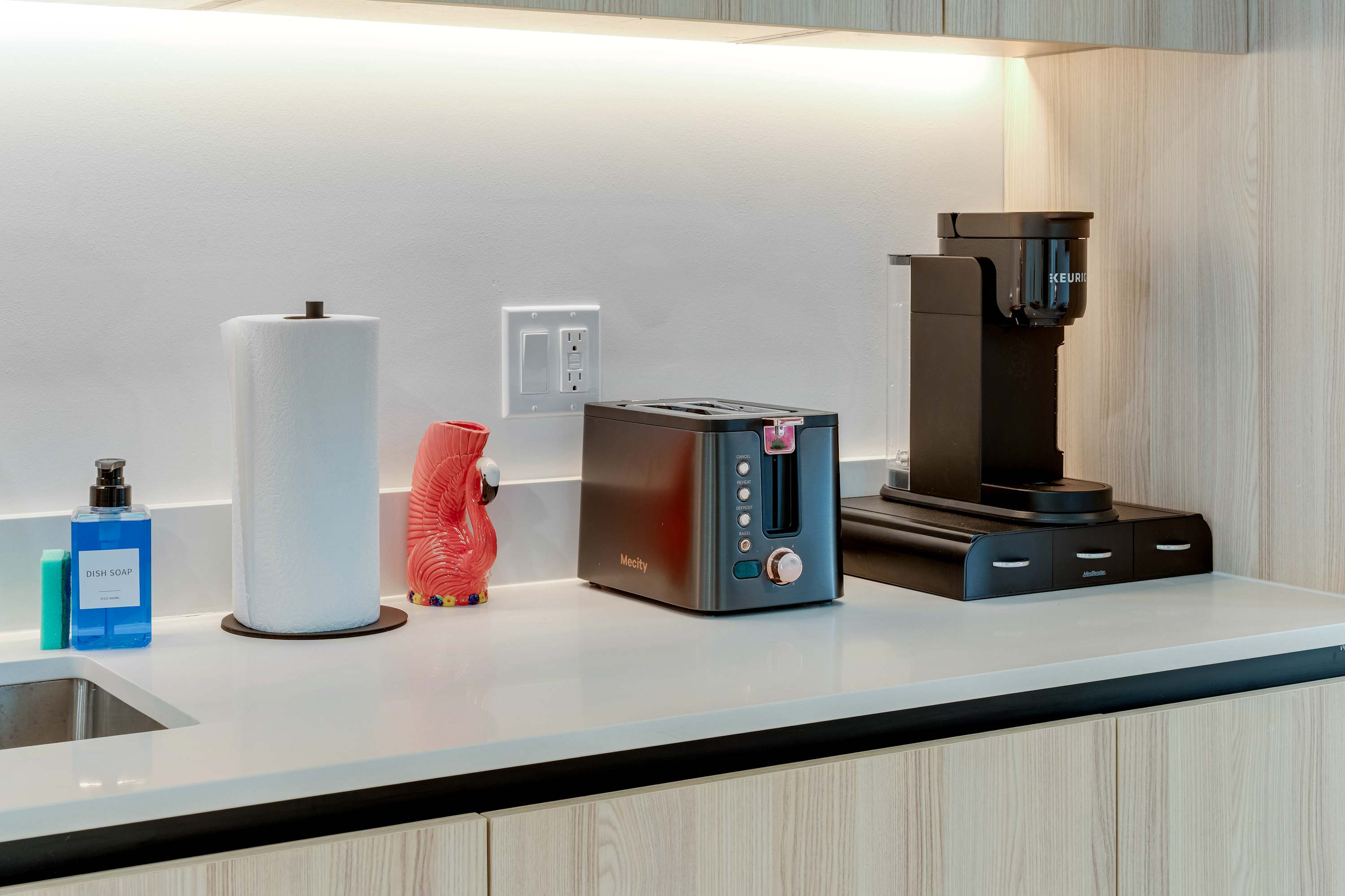 Equipped with modern appliances, including a full-size fridge, oven, stove, coffee machine, electric kettle, toaster, and essential cookware.