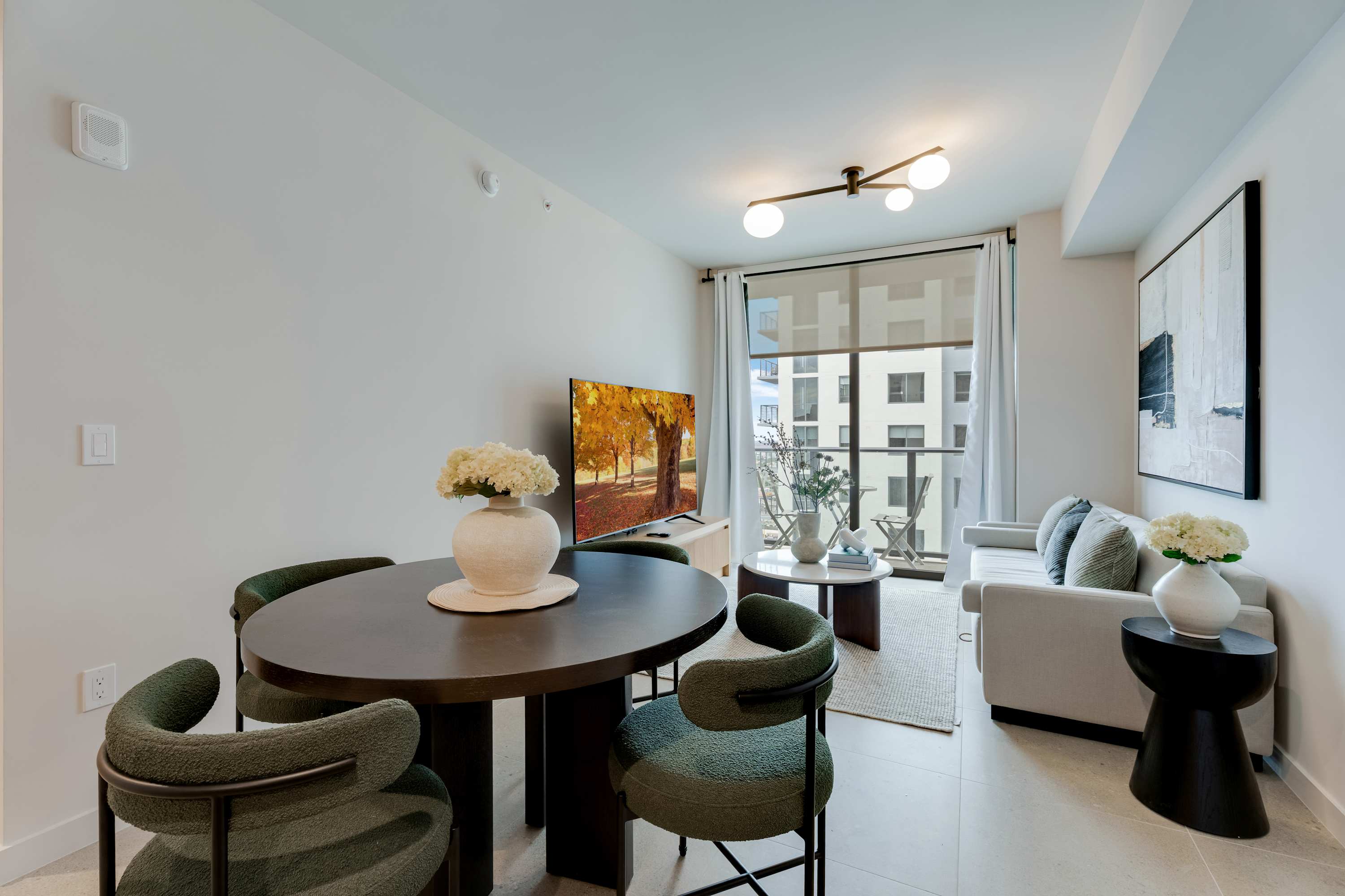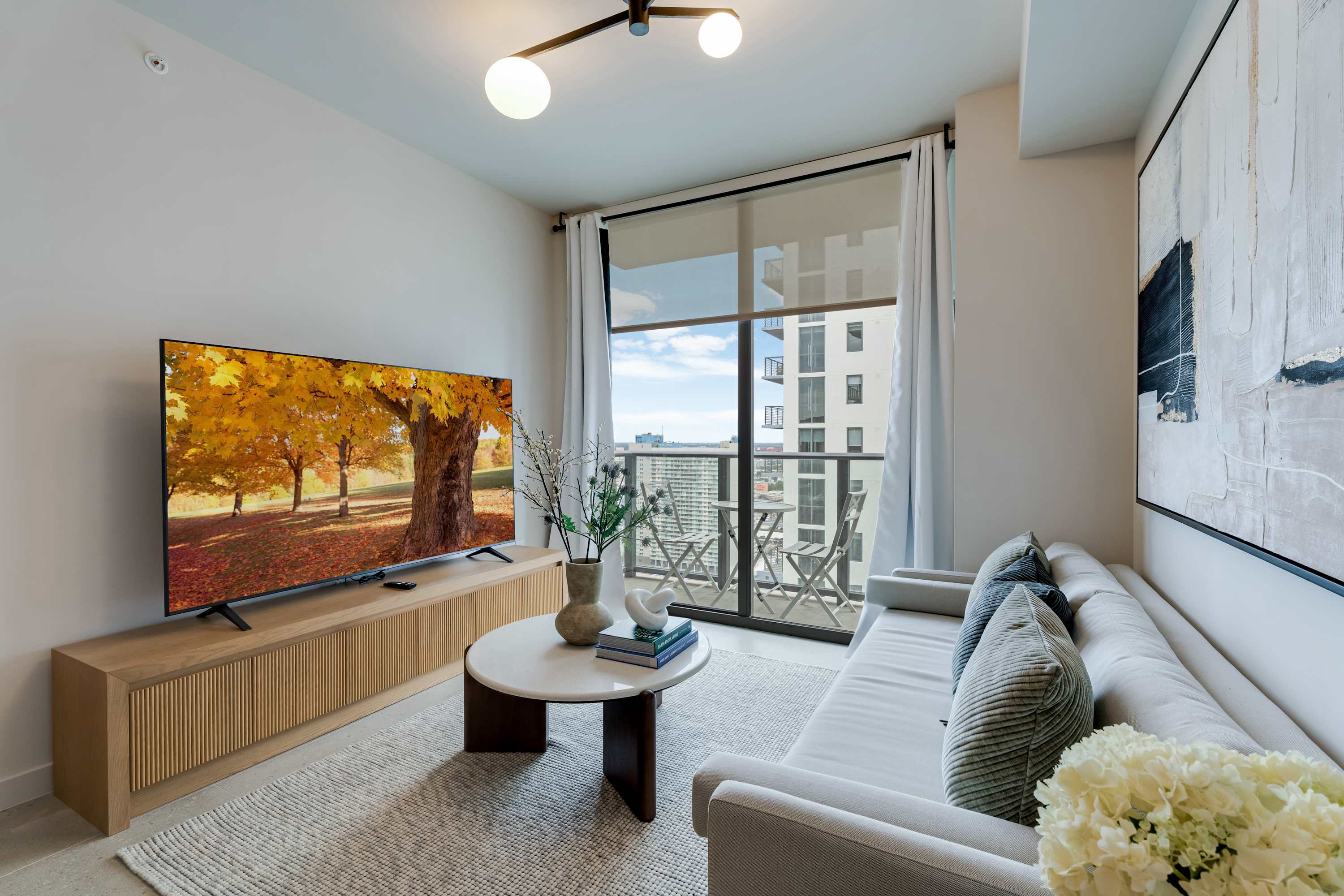 ★ LIVING ROOM: Features a queen sofa bed for additional accommodations and a Smart TV and large windows with lots of natural light and views. Open concept to the kitchen with a dining table in between the spaces.